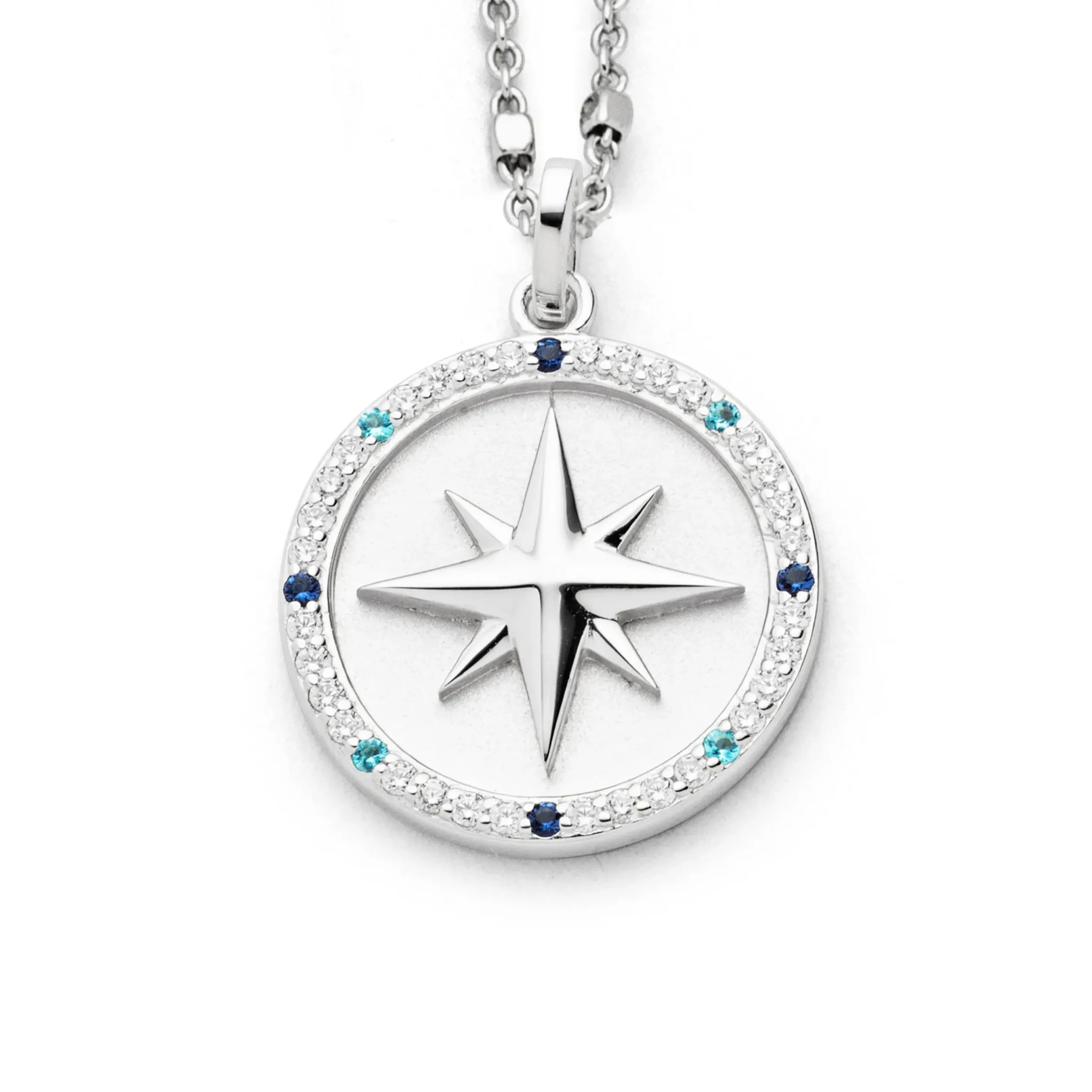 Anhänger „Kompassrose 2.0“ der äußere Rand ist mit 40 Zirkoniasteinen in den Farben, weiß, hellblau und dunkelblau besetzt, innen mattiert, aus poliertem, rhodiniertem 925er Sterling-Silber