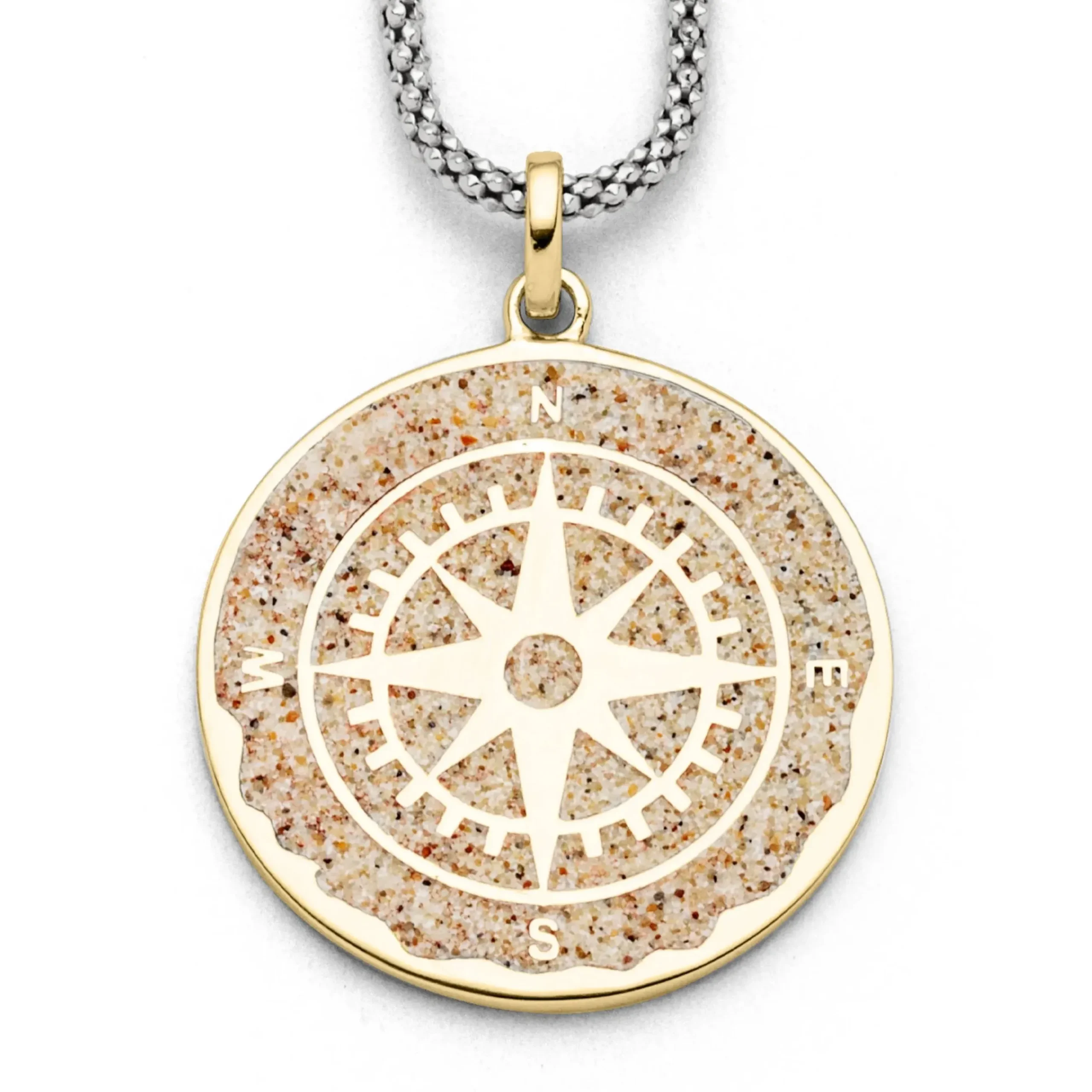 Runder Anhänger mit einer Kompassrose , eingebettet in Strandsand und gefasst in poliertem, vergoldetem 925er Sterling-Silber. Ausgestattet mit einer großen, ovalen Öse, dadurch an unterschiedlichen Ketten tragbar. Besonders gut kombinierbar mit einer vergoldeten Kugelkette.