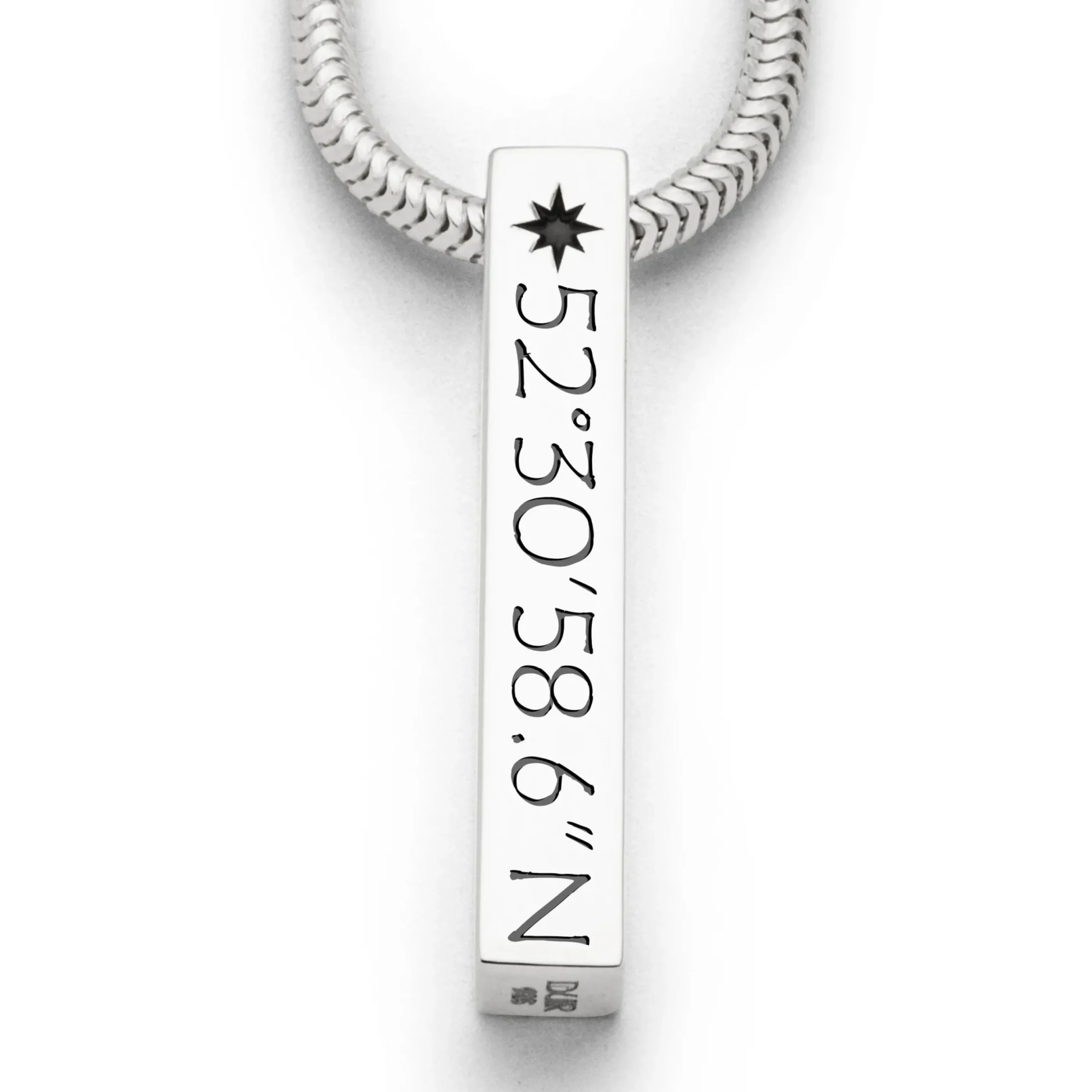 Massiver, dreidimensionaler Anhänger „Berlin“ mit den Koordinaten vom Brandenburger Tor (beidseitig), aus 925er Sterling-Silber. Die Kettendurchführung hat einen Innendurchmesser von 4 mm.