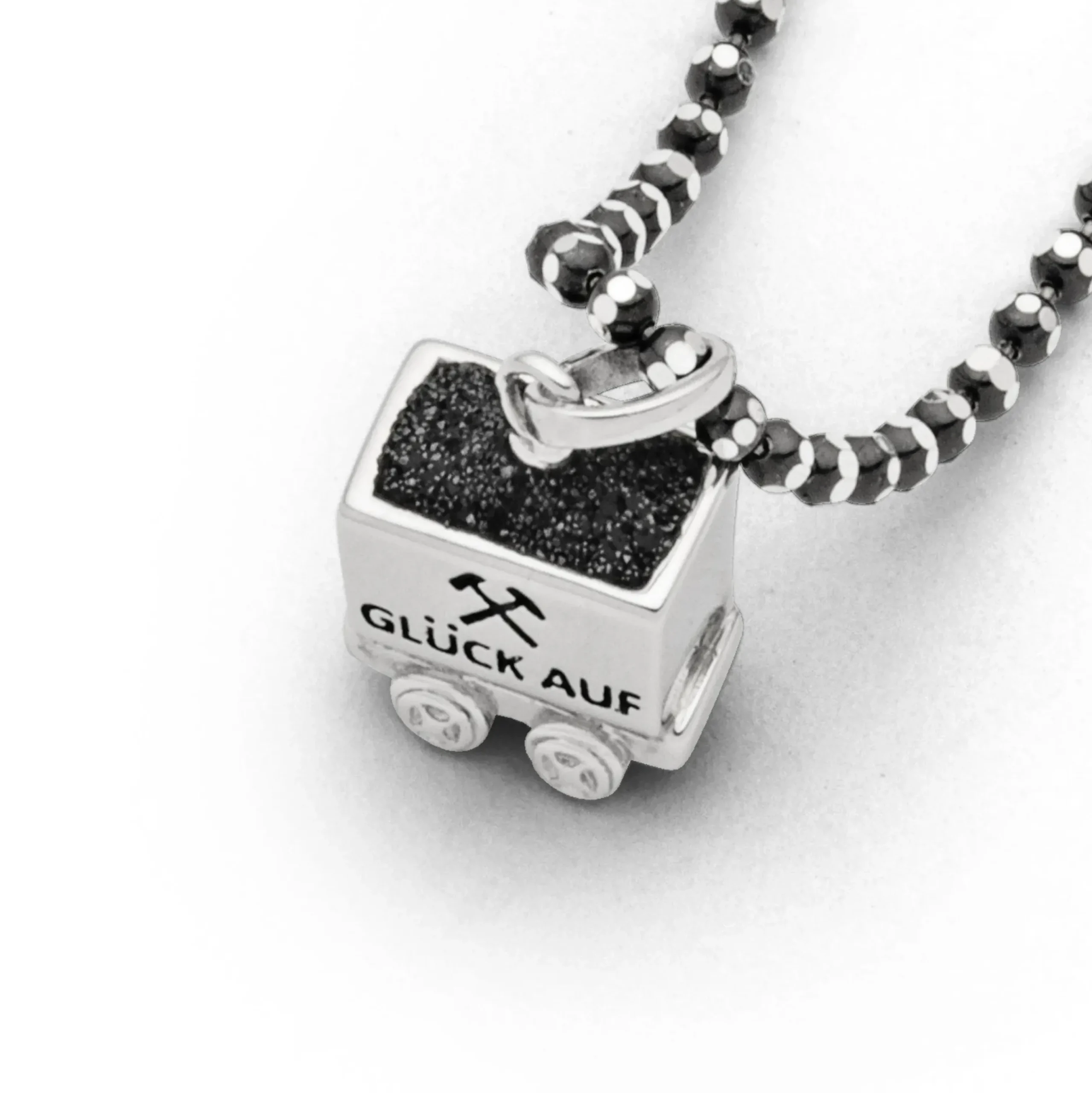 3 D Anhänger „Glück auf“ in Form einer Bergbaulore mit Beschriftung „Glück Auf“ und gefüllt mit Kohle, aus rhodiniertem 925er Sterling-Silber