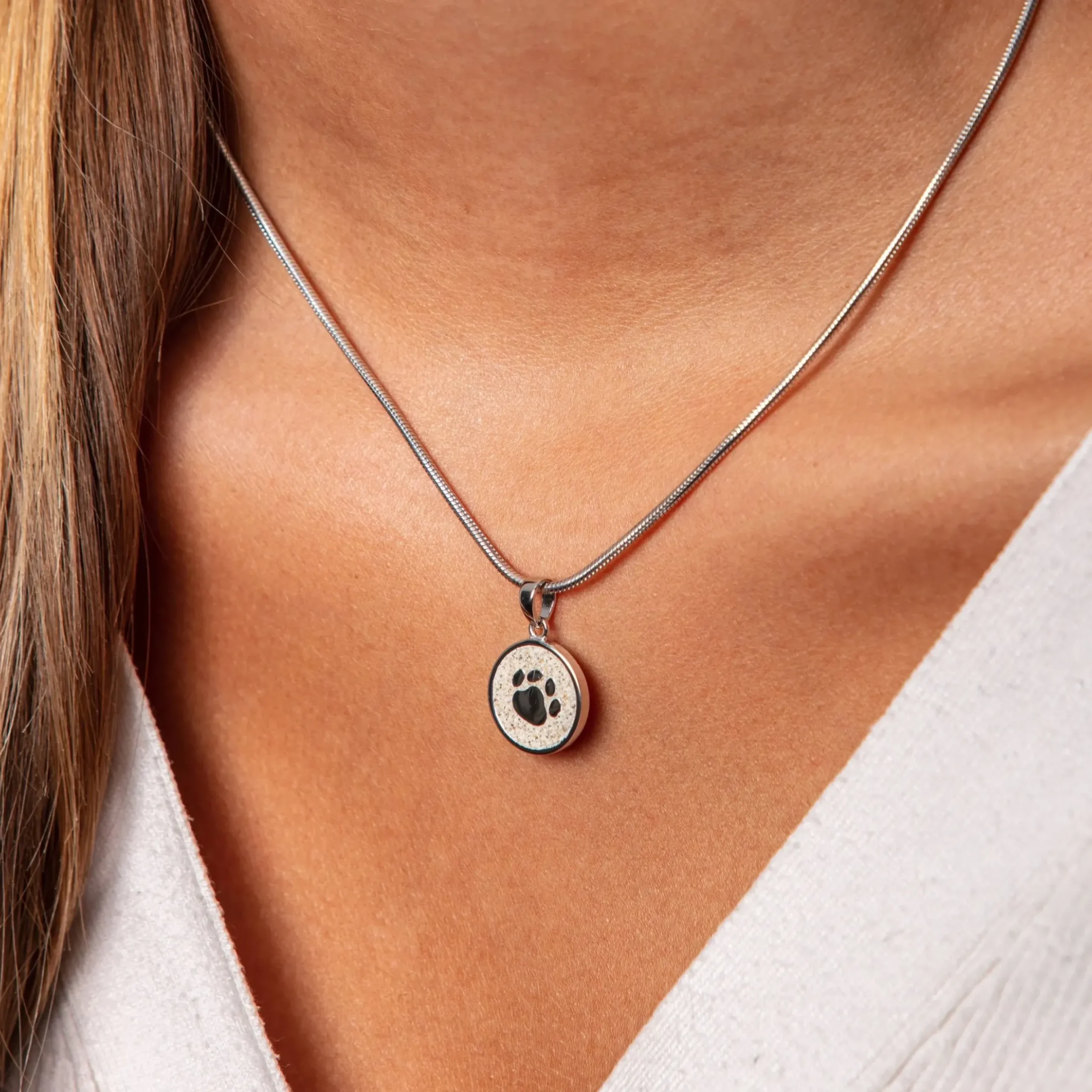 Runder Anhänger „Lucky Dog“ gefüllt mit Strandsand und einer Hundepfote aus Silber, gefasst in rhodiniertem 925er Silber