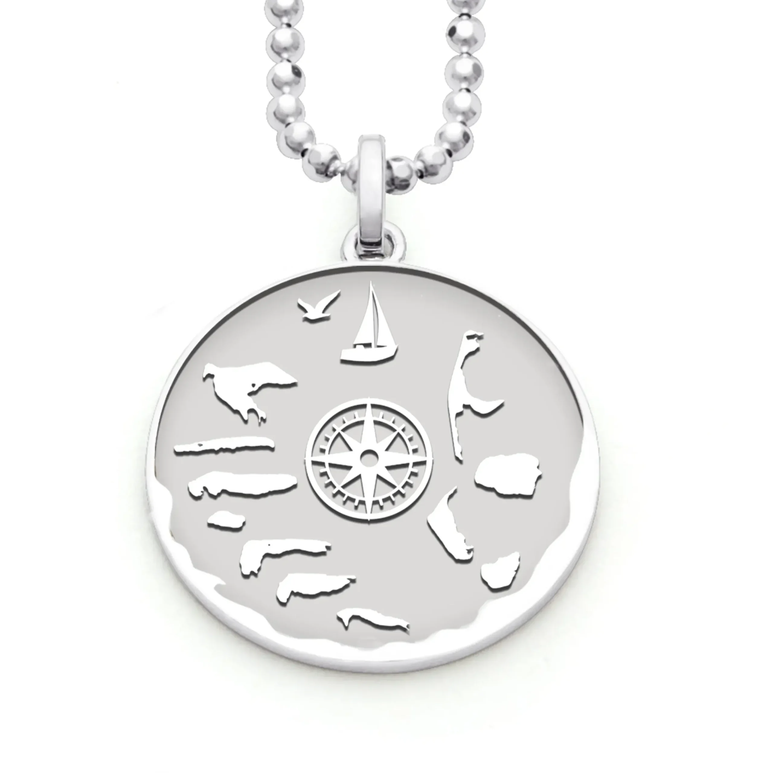 Runder Anhänger „Nordsee“ mit einer Kompassrose in der Mitte und den Motiven: die Sieben ostfriesischen Inseln: Borkum, Juist, Langeoog, Baltrum, Norderney, Spiekeroog, Wangerooge – Pellworm, Amrum, Föhr, Sylt – Segelboot & Möwe, alles gefasst in rhodiniertem, poliertem 925er Sterling-Silber.