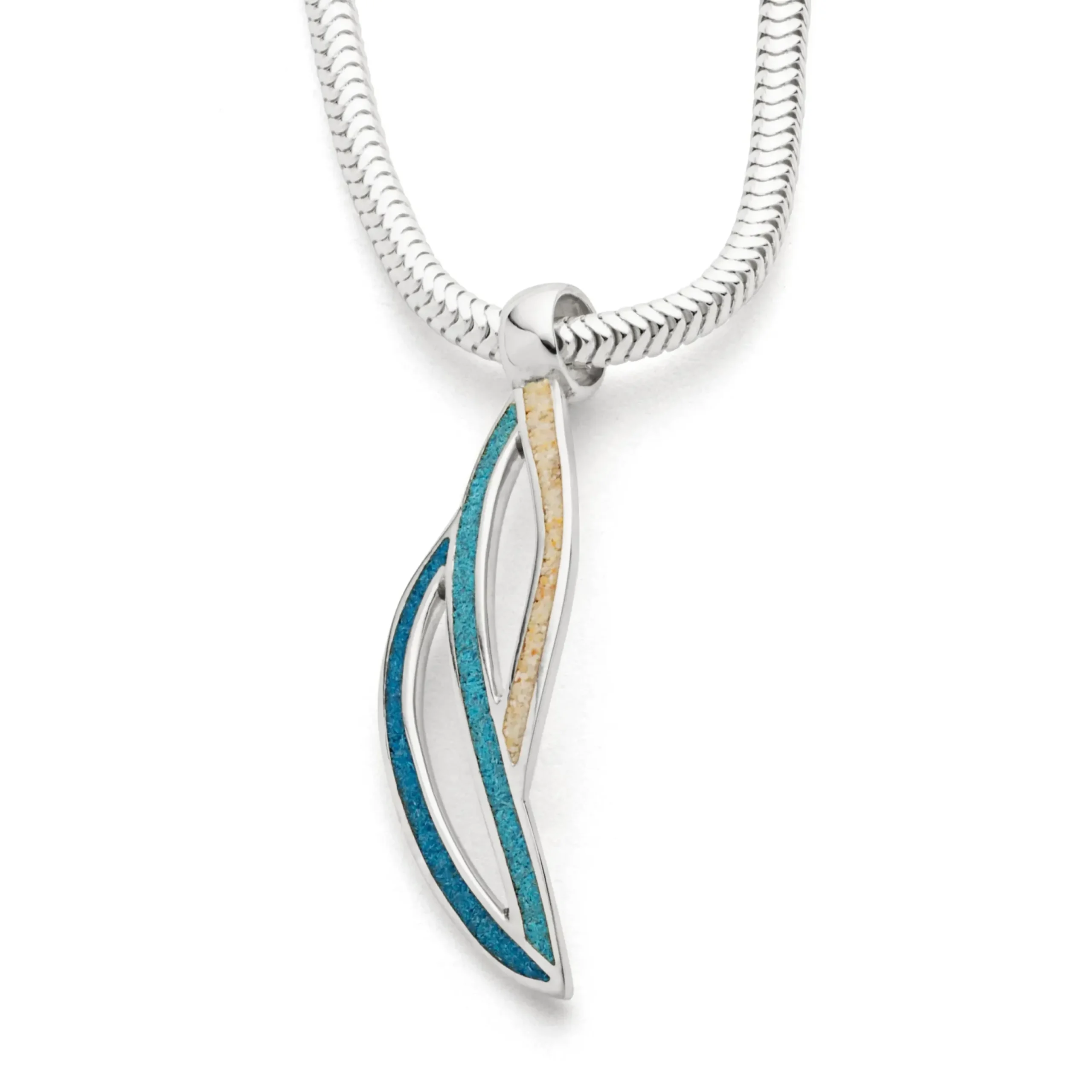 Länglicher geschwungener Anhänger „Ocean Stream“ gefüllt mit drei Sandarten (Strandsand, blauem Steinsand und hellblauem Steinsand), alles aus rhodiniertem und poliertem 925er Sterlingsilber