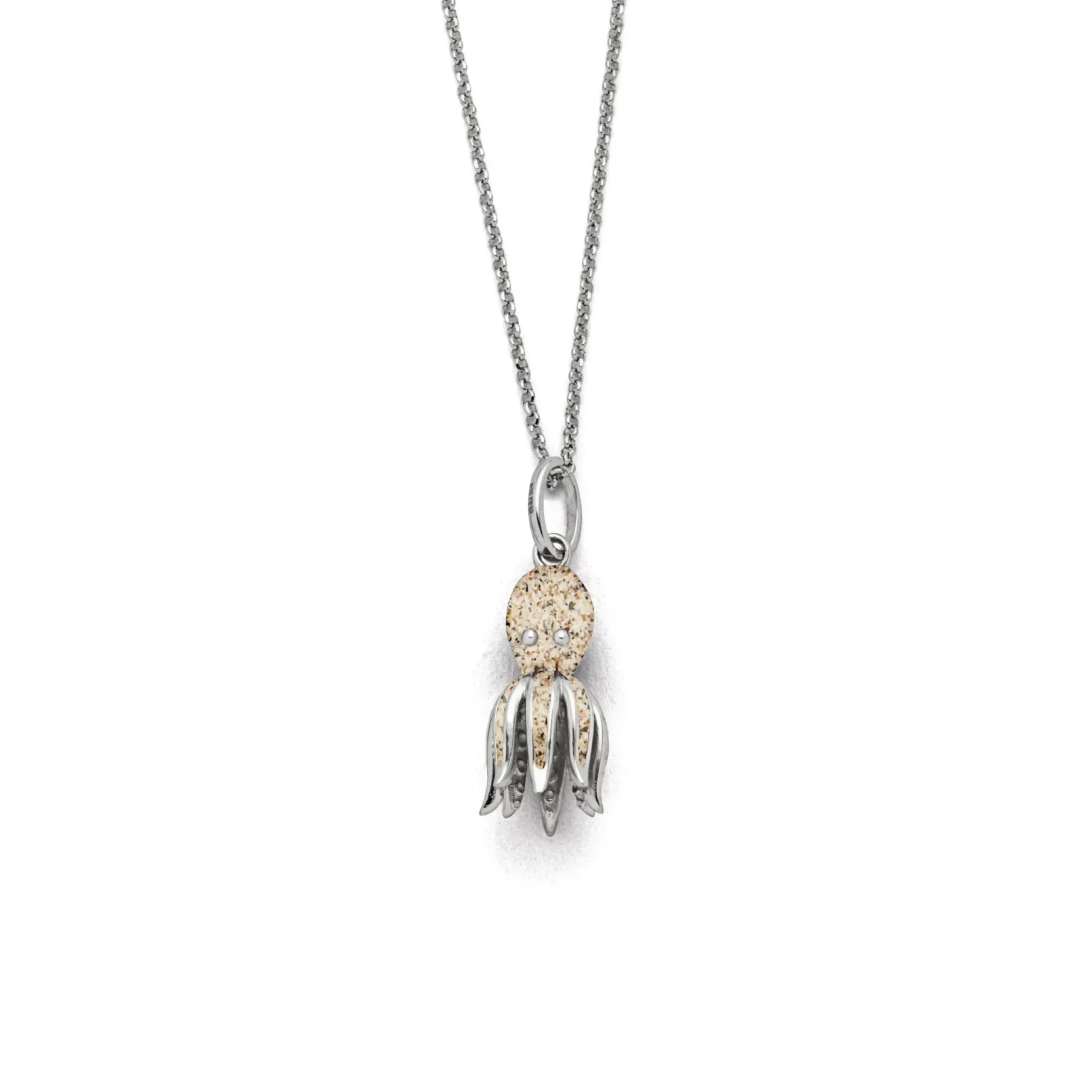 Echte Sehnsucht: Anhänger in Form eines Oktopus, gefüllt mit Strandsand, alles aus poliertem und rhodiniertem 925er Sterling-Silber