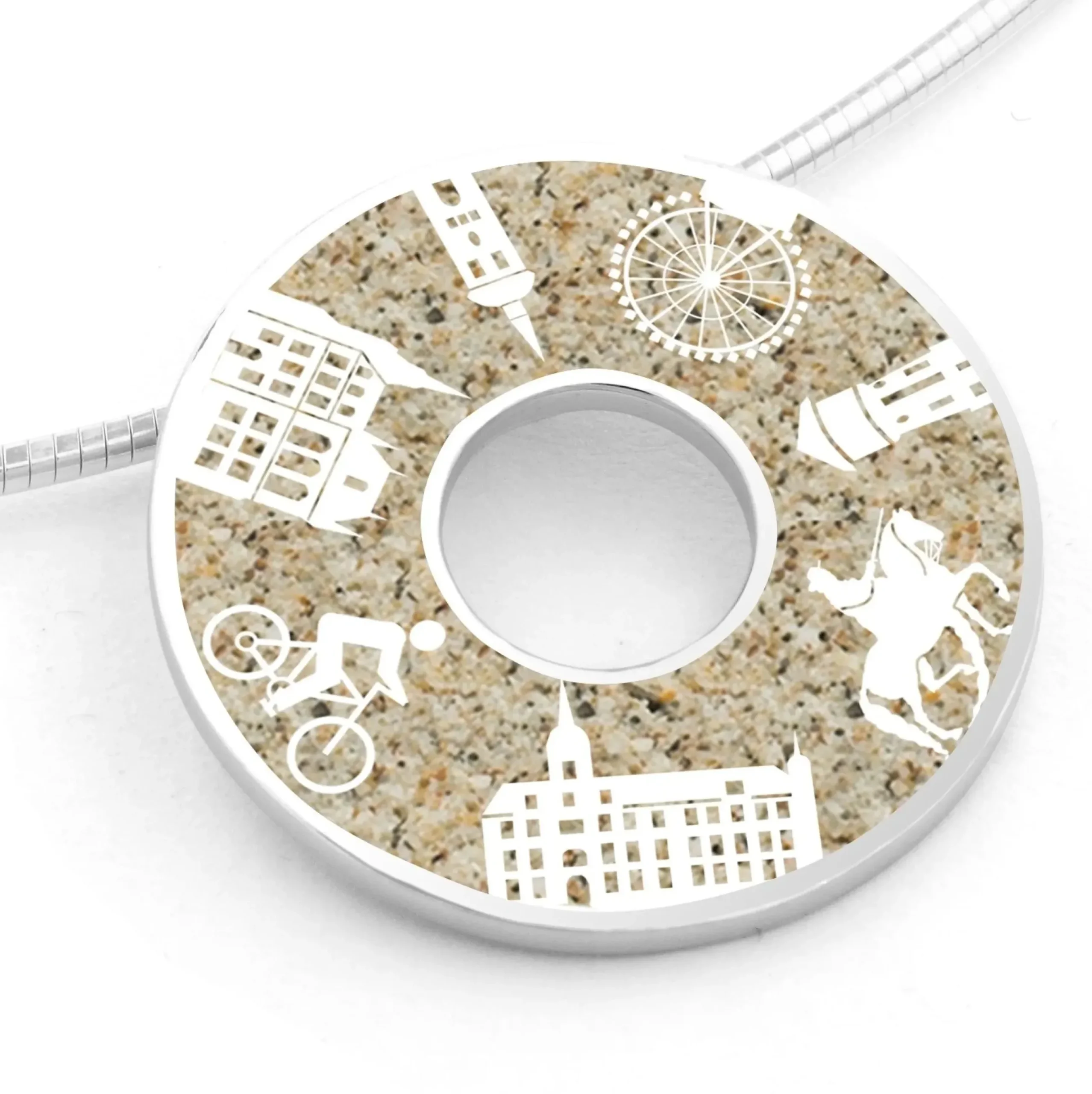Oldenburg – eine Stadt mit vielen Facetten. Die norddeutsche Universitätsstadt fasziniert durch weitläufige Grünflächen, historische Denkmäler und ein belebtes Stadtzentrum. Als Erinnerung an einen schönen Aufenthalt, einen besonderen Lebensabschnitt, oder für alle, die Verbundenheit zur Heimatstadt stilvoll zum Ausdruck bringen möchten, ist dieser elegante und zeitlose Anhänger unverzichtbar.Der glanzvolle Anhänger, mit Kettenöse auf der Rückseite, verspricht höchsten Tragekomfort durch hochwertige Materialien und überzeugt durch sein klares Design, sowie eine hohe Symbolik, die ihn für jeden Tragenden einzigartig macht.Auf dem feinen Strandsand sind formschön verschiedene Motive der Stadt eingearbeitet (Rathaus, Lappan, Kramermarkt (Riesenrad), Wasserturm, Graf Anton Günther, Schloss, Fahrradfahrer), welche die Vielfältigkeit des Oldenburger Lebens auf zauberhafte Weise einfangen.Der geschmackvolle Kontrast zwischen poliertem, rhodiniertem Silber, sowie den feinen Sandkörnen zieht alle Blicke auf sich und erinnert an Urlaub am Meer. Funkeln sie mit diesem entzückenden Schmuckstück um die Wette und tragen Sie immer einen Teil Ihrer Stadt ganz nah bei sich.