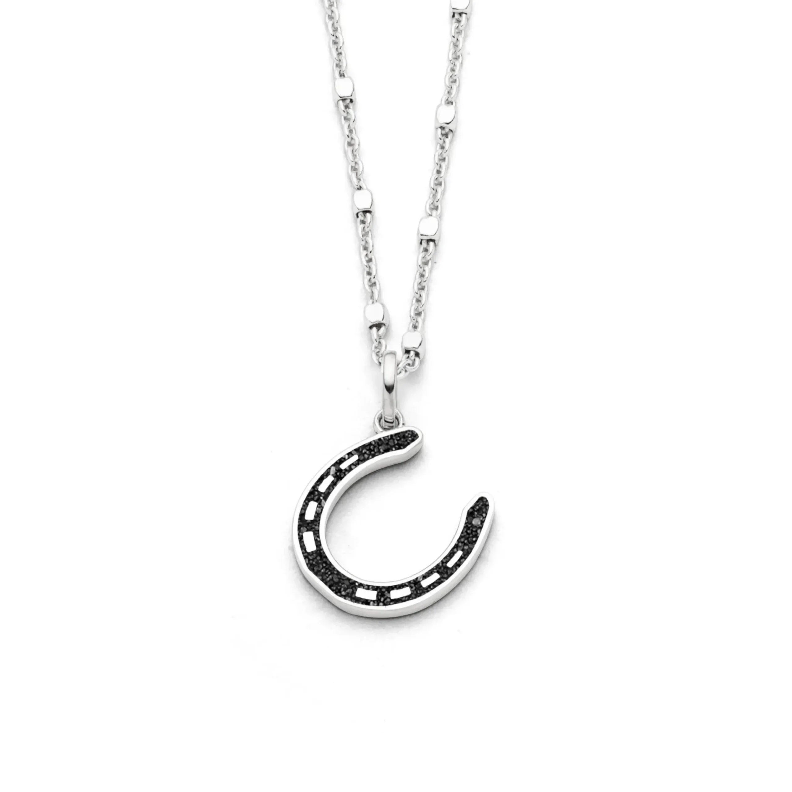 Anhänger Pferdeglück in Form eines Hufeisens, teilweise gefüllt mit Lavasand, alles aus poliertem und rhodiniertem 925er Sterling-Silber
