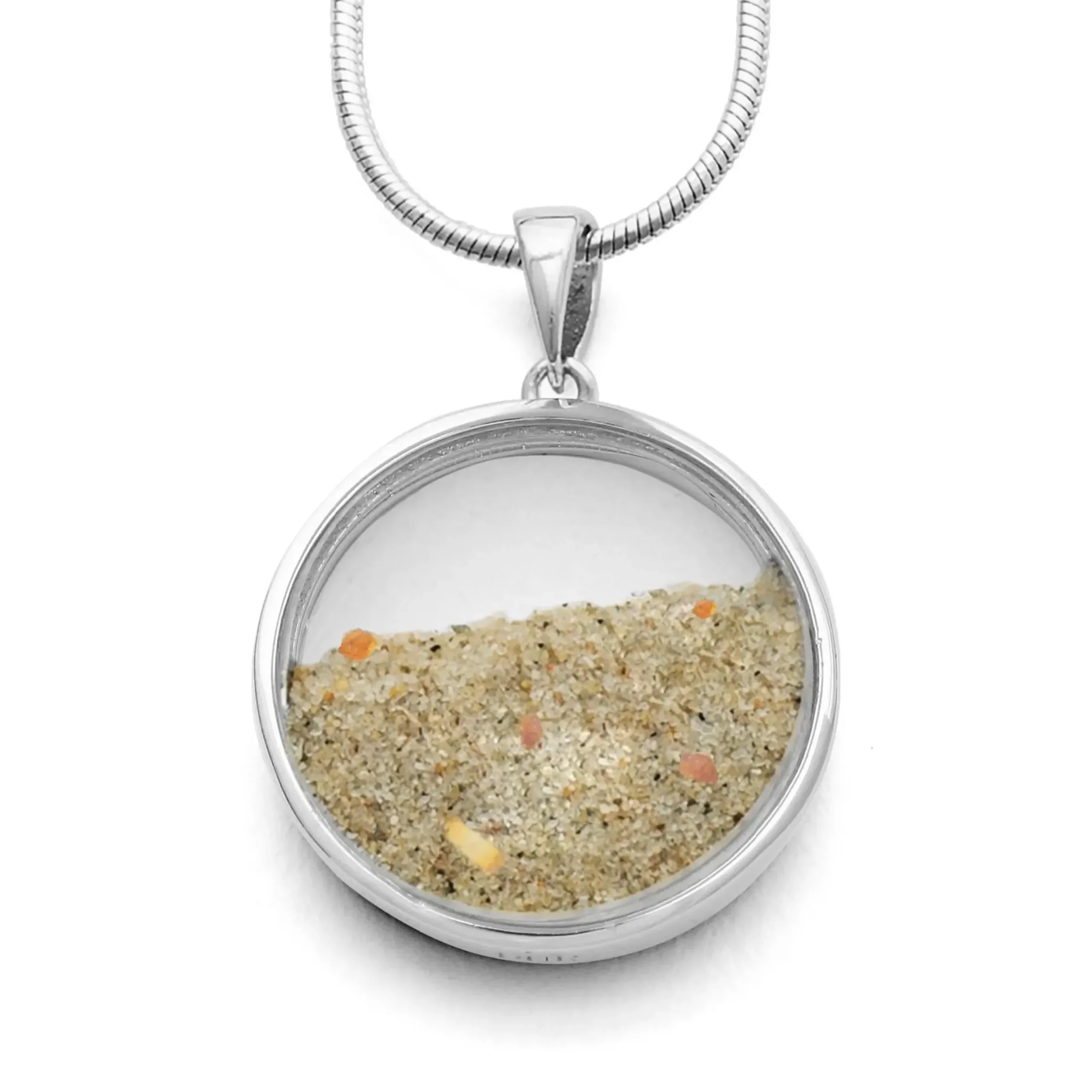Großer runder Anhänger „Sandsturm II“, gefüllt mit losem Strandsand und Bernsteinstücken, transparent eingearbeitet in Glas und gefasst in rhodiniertem 925er Sterling-Silber. Durch die größere Öse gut kombinierbar mit verschiedenen Ketten, zum Beispiel Kugelketten. Durch die Rhodinierung ist das Schmuckstück anlaufgeschützt.