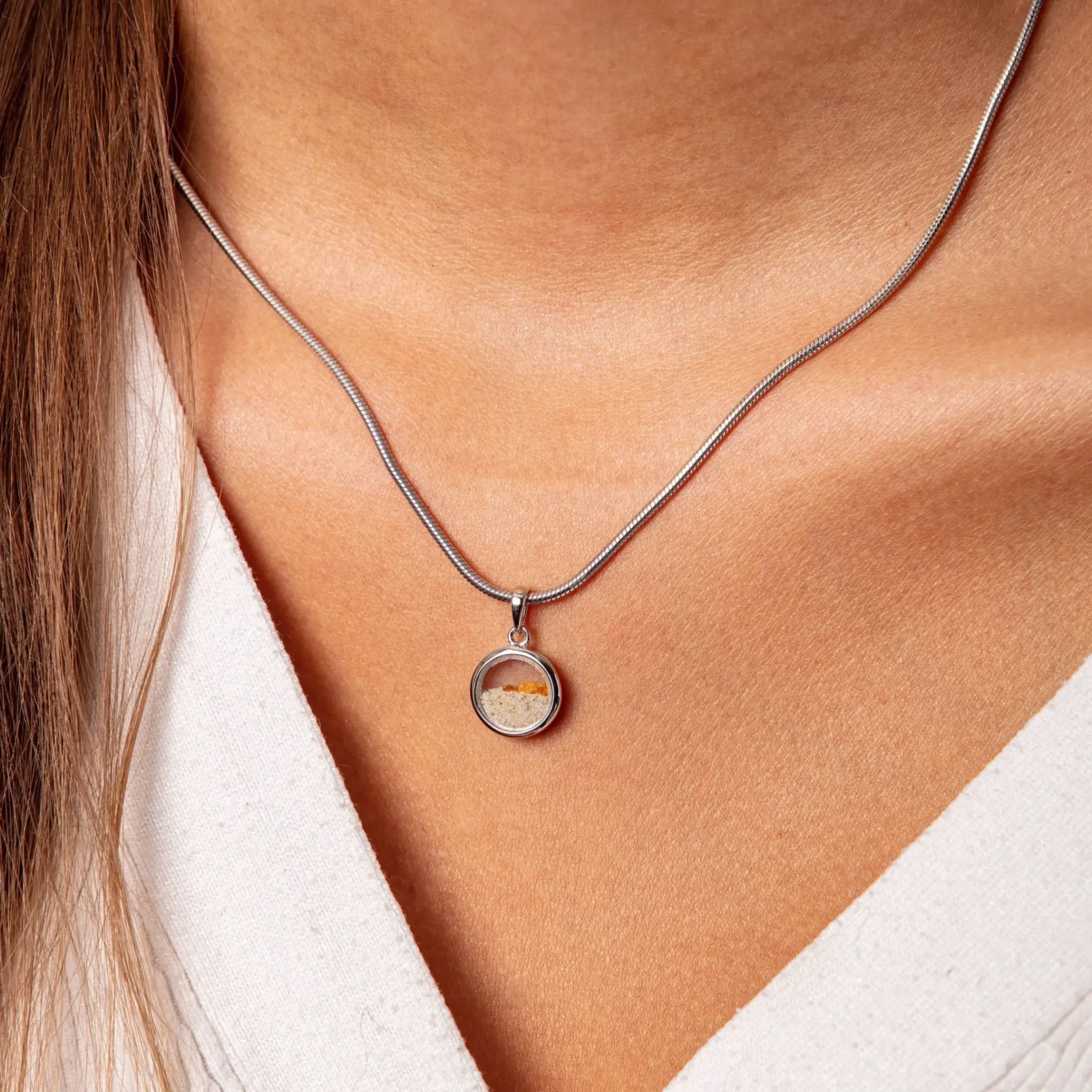 Anhänger „Sandsturm“ klein rund, gefüllt mit losem Strandsand und Bernsteinstückchen, eingearbeitet in Glas und gefasst in rhodiniertem 925er Sterling-Silber