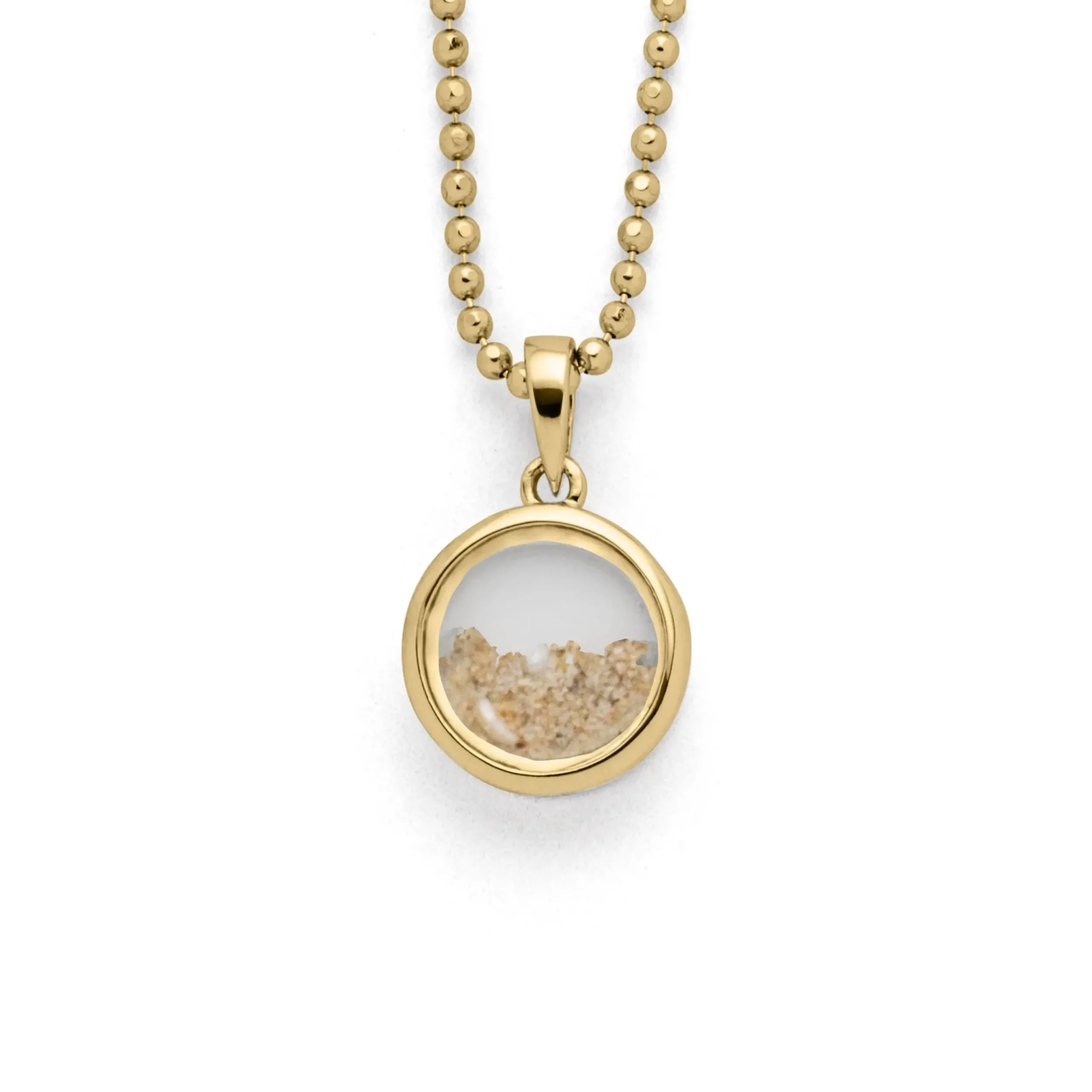 Kleiner, runder Anhänger „Sandsturm“, gefüllt mit losem Strandsand und Muschelstückchen . Transparent eingearbeitet in Glas und gefasst in vergoldetem 925er Sterling-Silber. Gut kombinierbar mit zierlichen Ketten, zum Beispiel feinen Kugelketten.