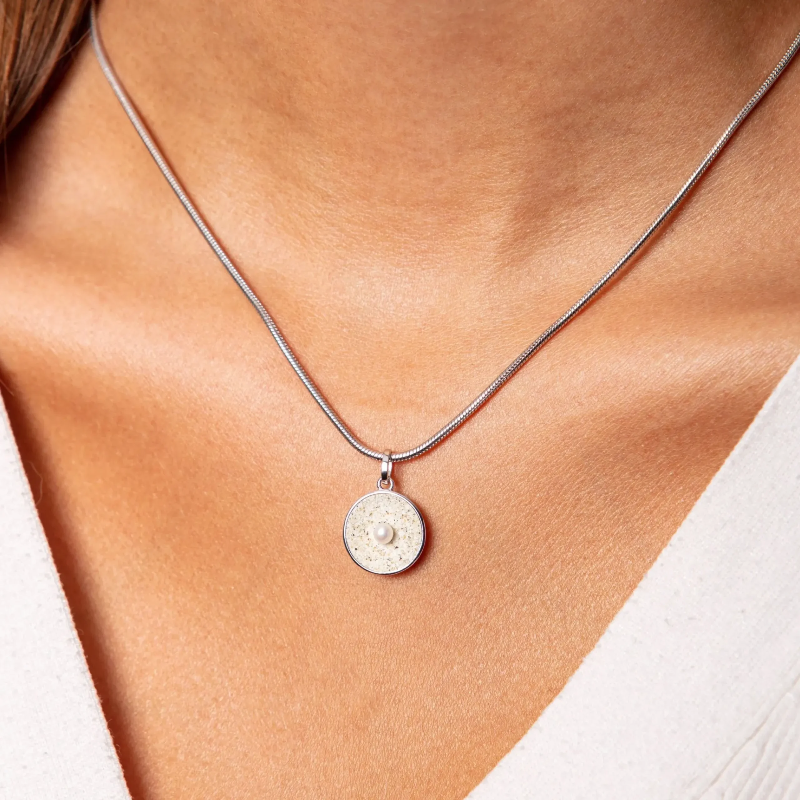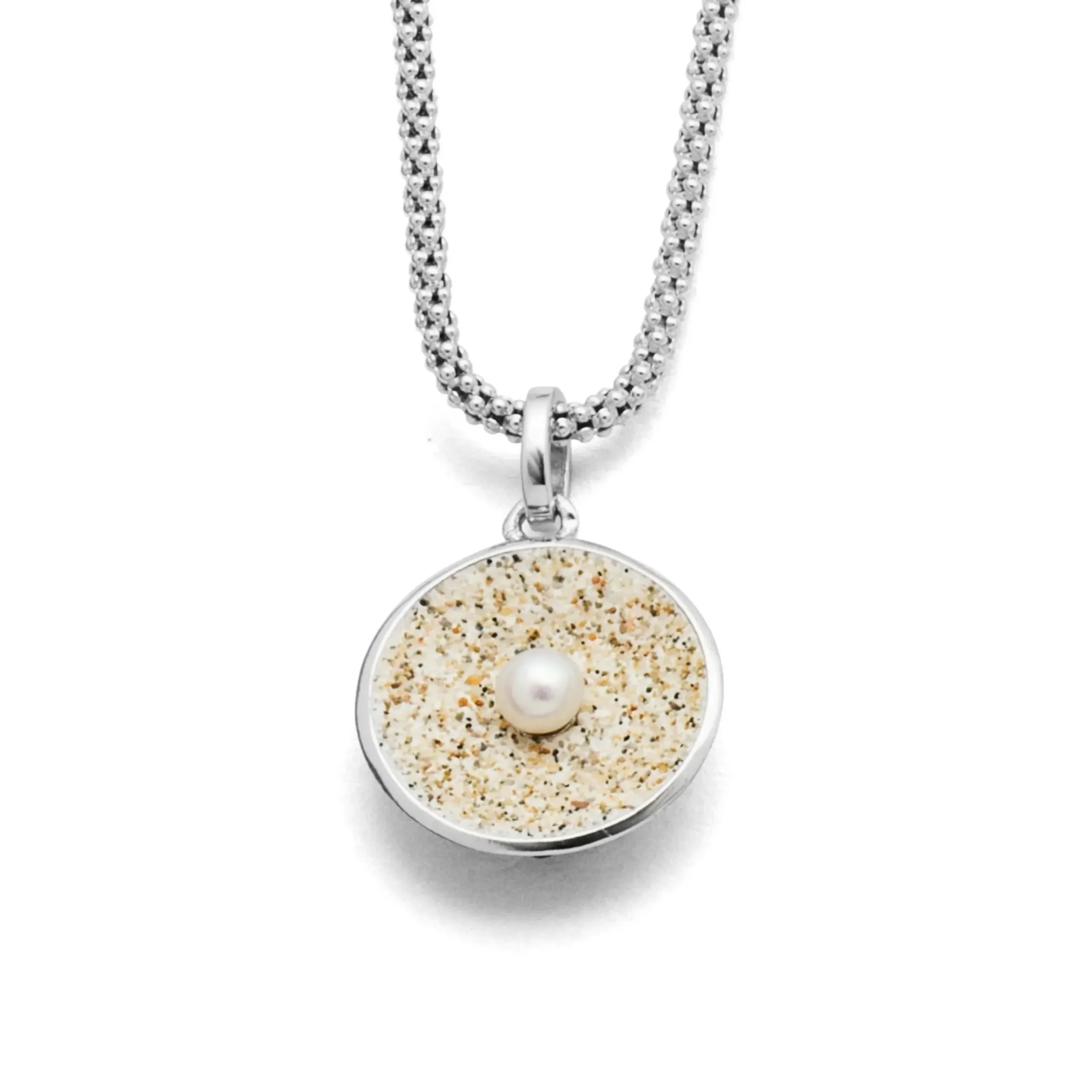 Anhänger aus einer flachen Schale aus rhodiniertem 925er Sterling-Silber, gefüllt mit Strandsand und einer kleinen, mittig gesetzten Süßwasserperle