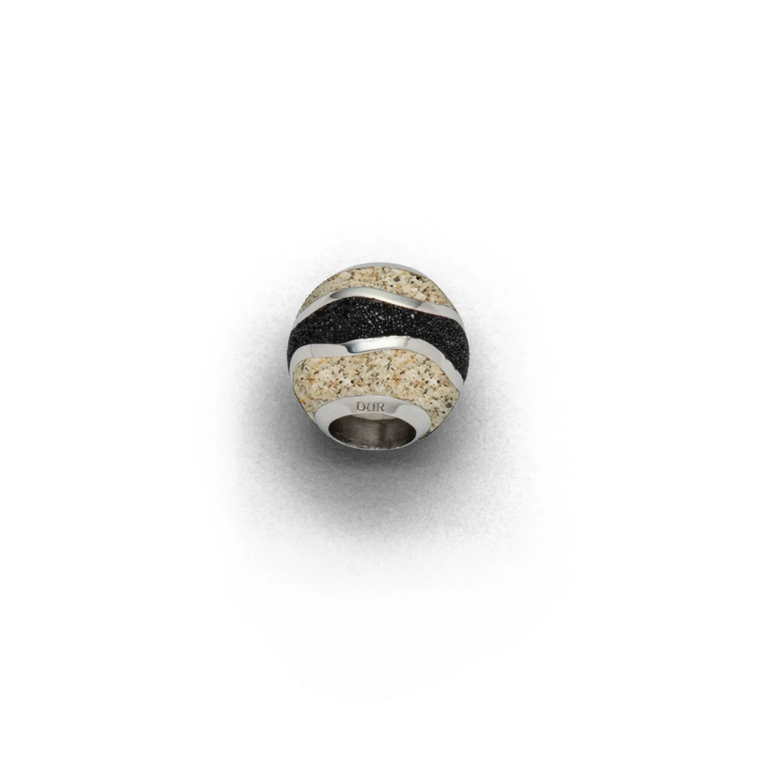 Strandsandkugel mit 2 silbernen Wellen, im Wechsel eingebettet in Strandsand/Lavasand/Strandsand, gefaßt in rhodinierten 925er Sterling-Silber