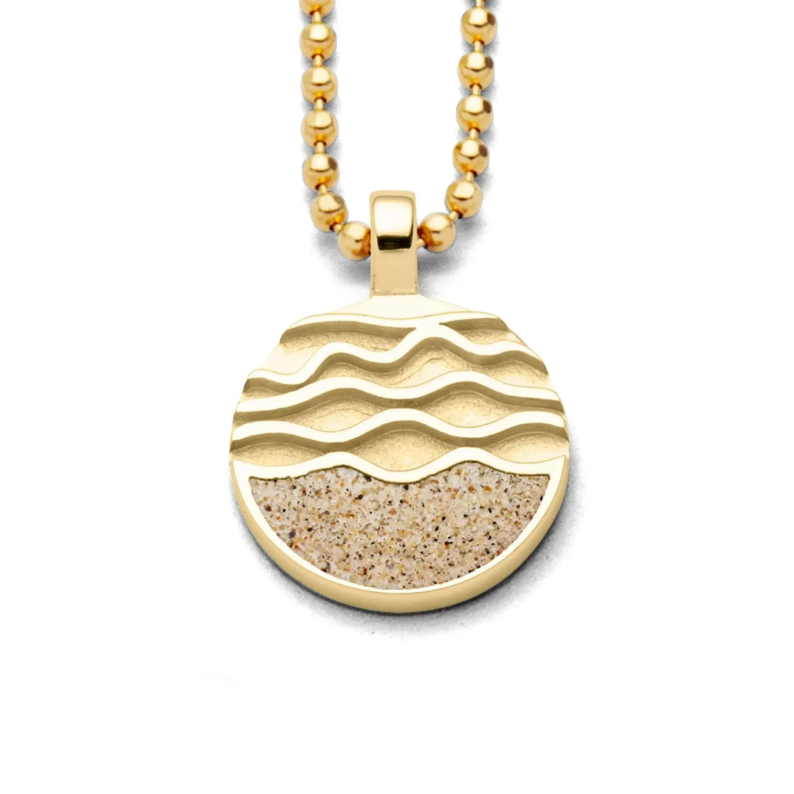 Kleiner, runder Anhänger „Strandwellen 2.0“, im unteren Drittel mit Strandsand gefüllt und gefertigt aus poliertem, vergoldetem 925er Sterling-Silber. Durch die große Öse ist eine Kombination mit verschiedenen Ketten möglich.