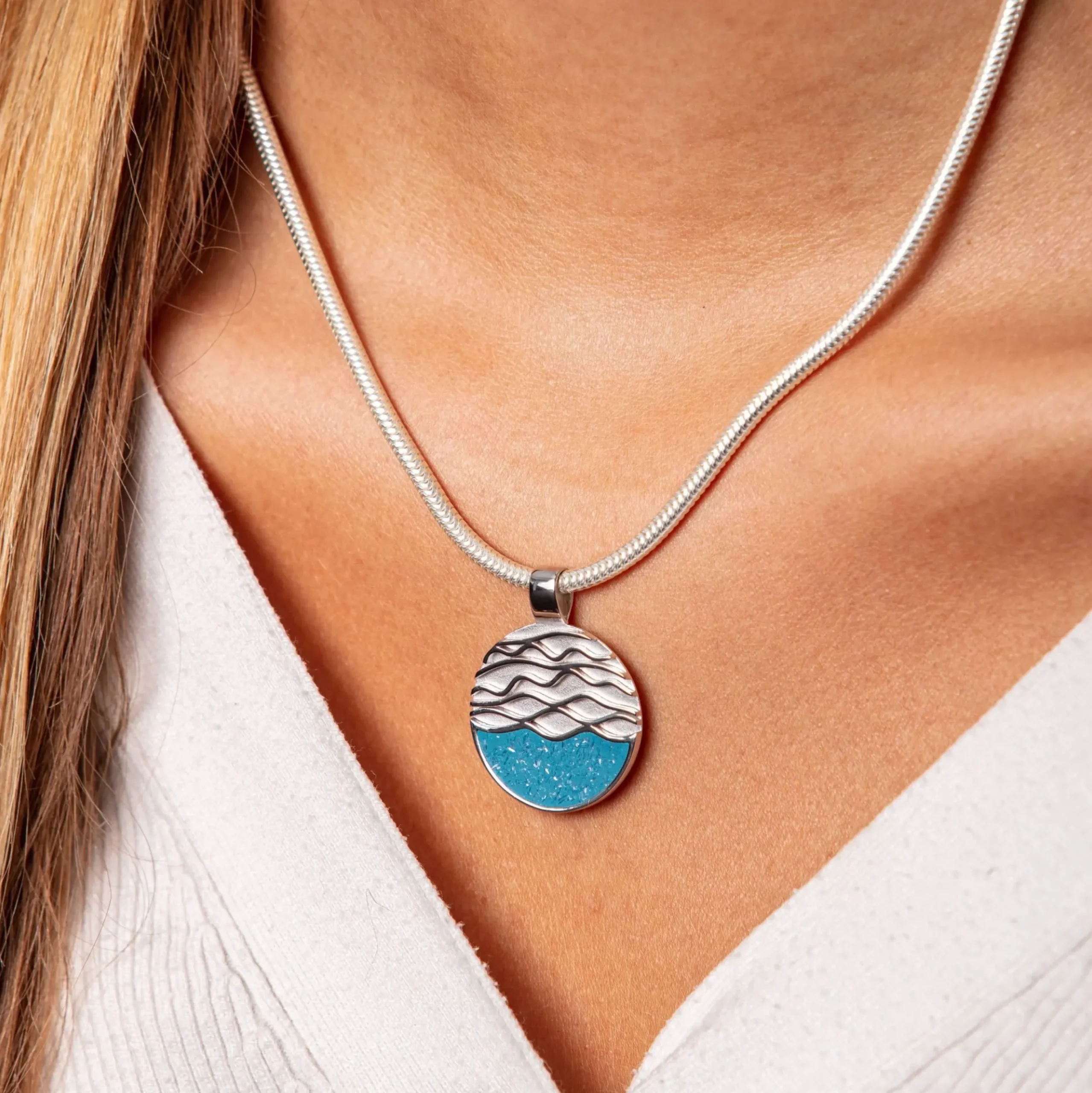 Runder Anhänger „Strandwellen“ im unteren Drittel mit blauem Steinsand gefüllt und großer Öse aus rhodiniertem 925er Sterlingsilber.