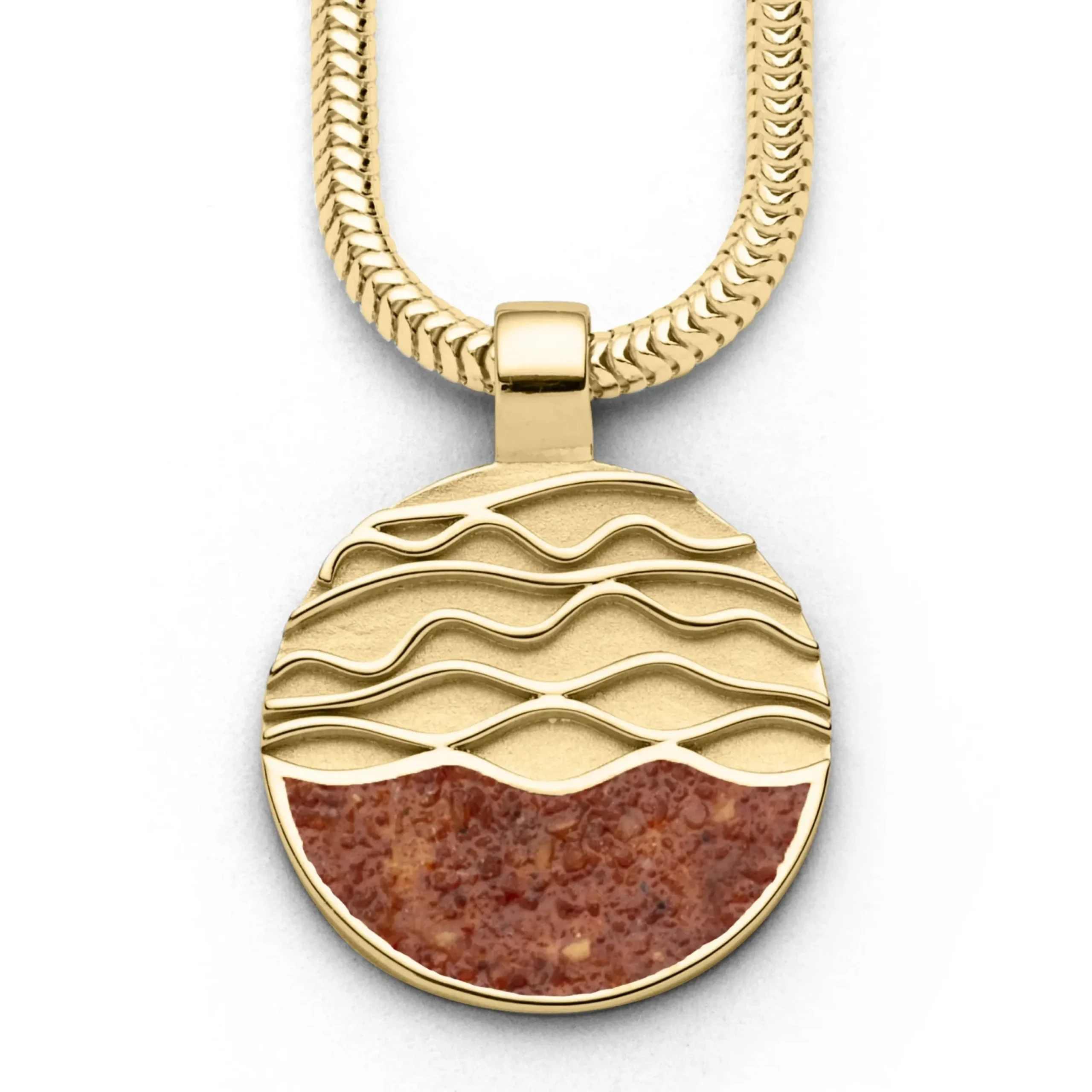Runder Anhänger „Strandwellen“ im unteren Drittel mit Bernstein gefüllt und großer Öse aus vergoldetem 925er Sterlingsilber.