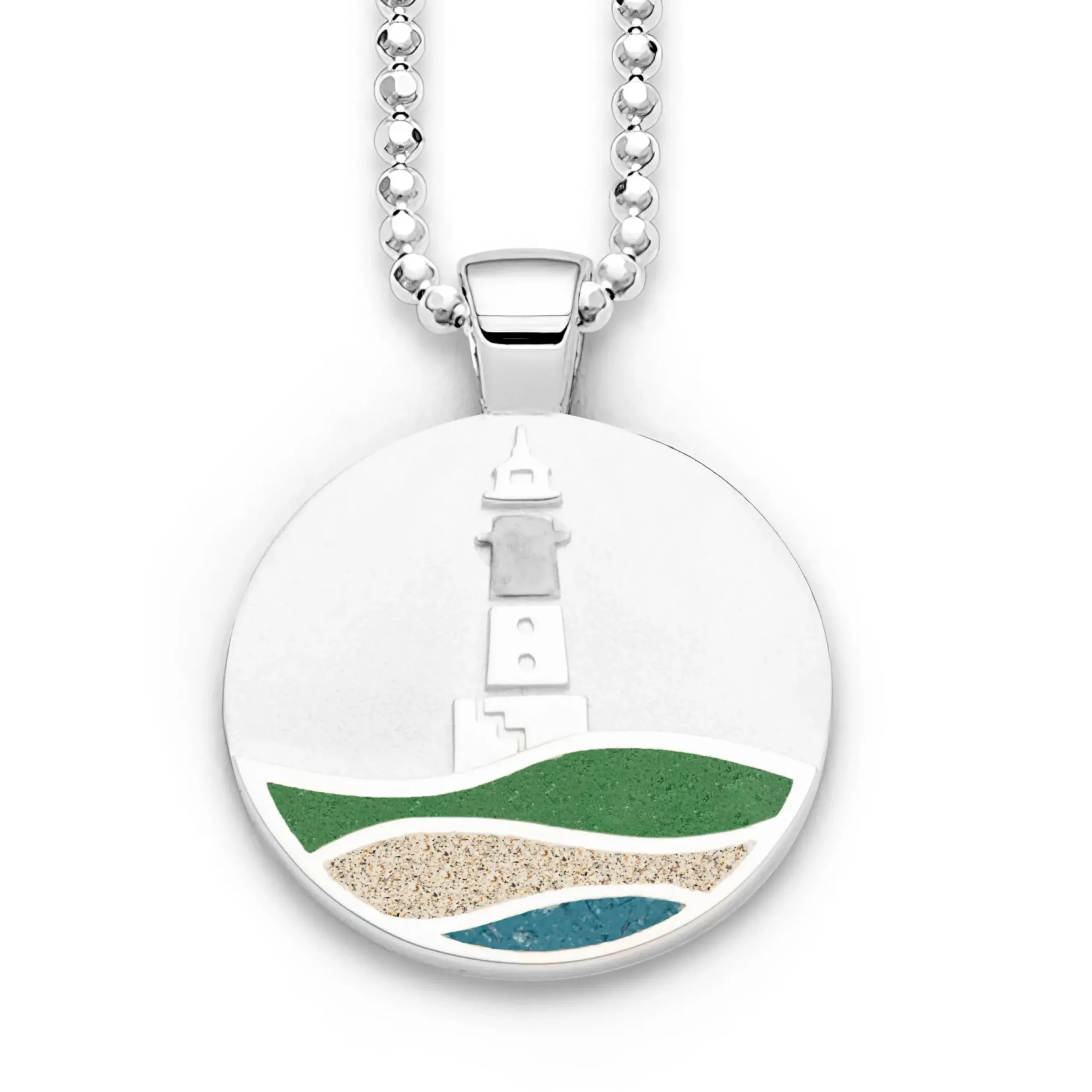 Runder Anhänger Strandwellen „Büsum“ mit dem Motiv: Büsumer Leuchtturm, die Wellen sind eingebettet in Strandsand, grünen (Malachit) und blauen Steinsand (Kyanit), alles gefasst in poliertem, rhodiniertem 925er Sterling-Silber.