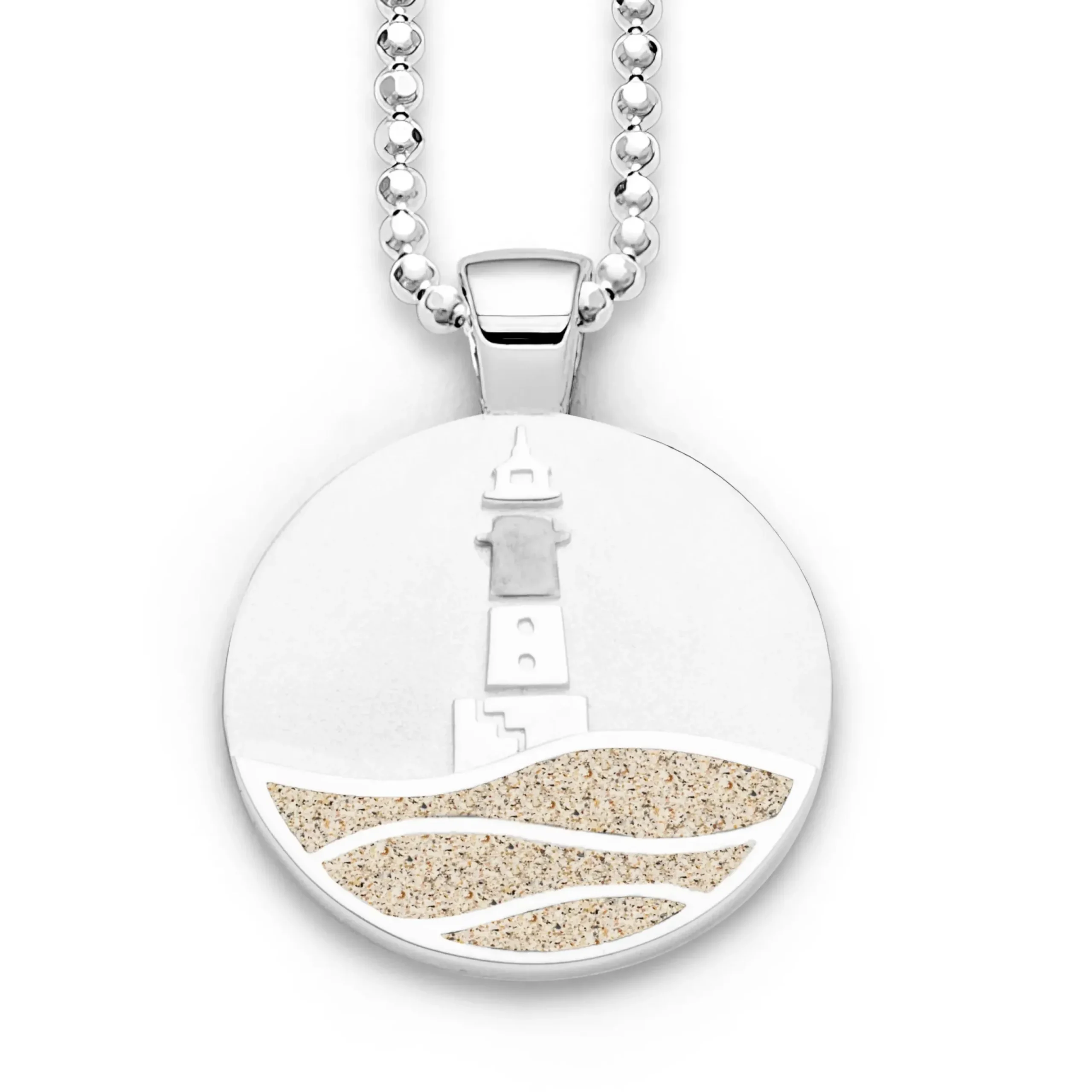 Runder Anhänger Strandwellen „Büsum“ mit dem Motiv: Büsumer Leuchtturm, die Wellen sind eingebettet in Strandsand, alles gefasst in poliertem, rhodiniertem 925er Sterling-Silber.