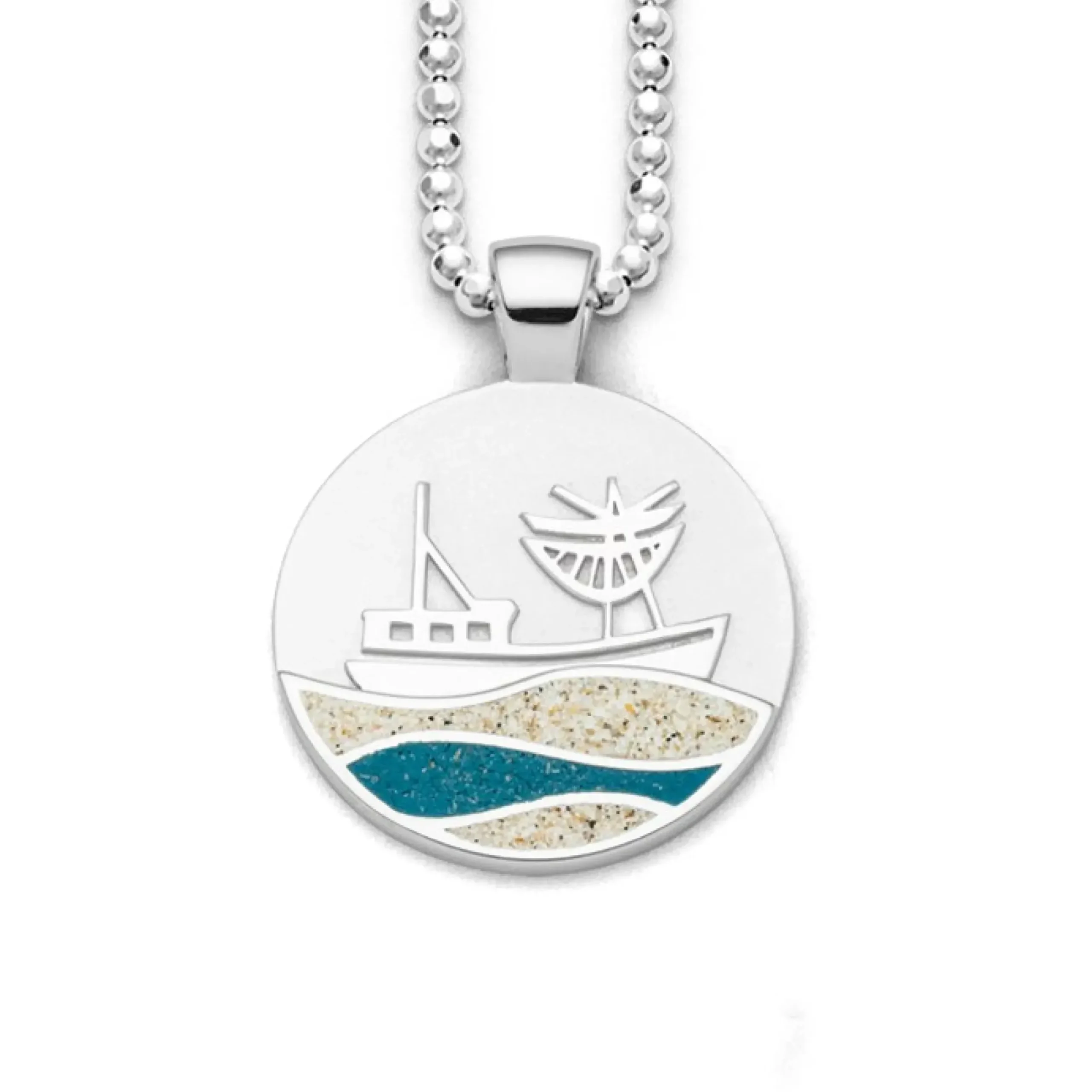 Runder Anhänger Strandwellen mit dem Motiv: „Kutter“ die Wellen sind abwechselnd eingebettet in Strandsand und blauem Steinsand, alles gefasst in poliertem, rhodiniertem 925er Sterling-Silber.
