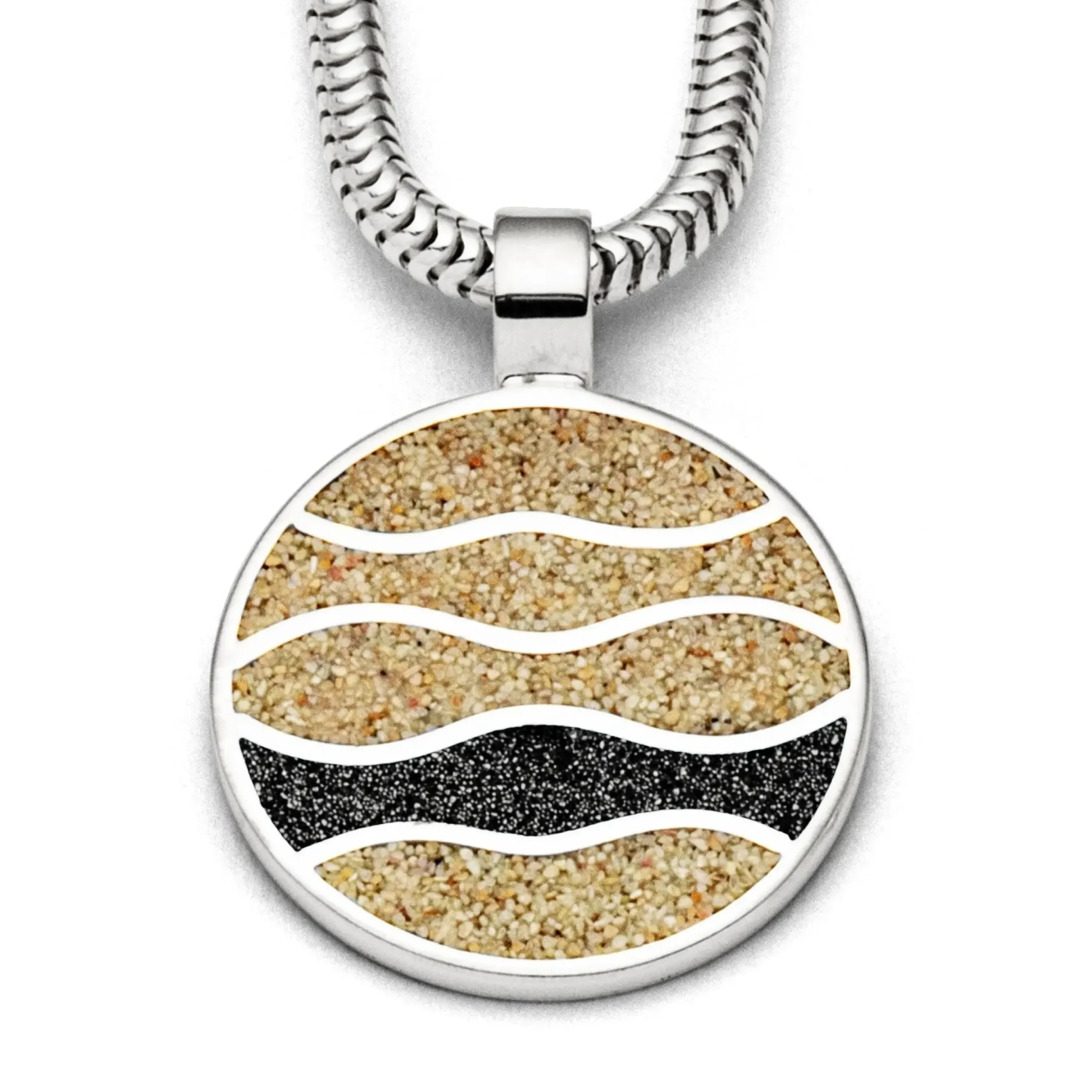 Anhänger „Strandwellen“ runder Anhänger mit Wellen, gefüllt mit Strandsand und schwarzem Lavasand, aus rhodiniertem 925er Sterlingsilber.