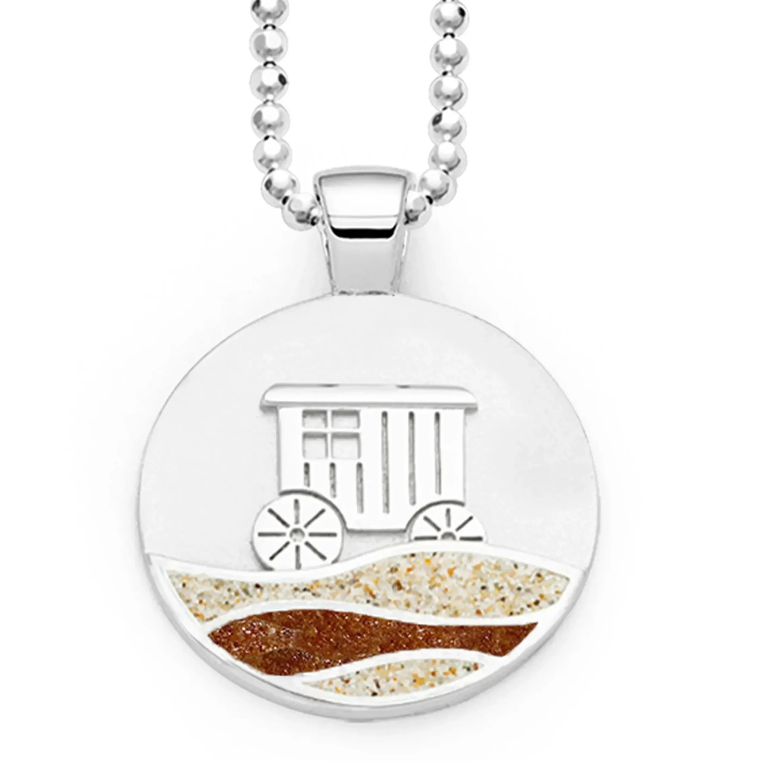Runder Anhänger Strandwellen „Norderney“ mit dem Motiv:Badekarren, die Wellen sind abwechselnd eingebettet in Strandsand und Bernsteinsand, alles gefasst in poliertem, rhodiniertem 925er Sterling-Silber.