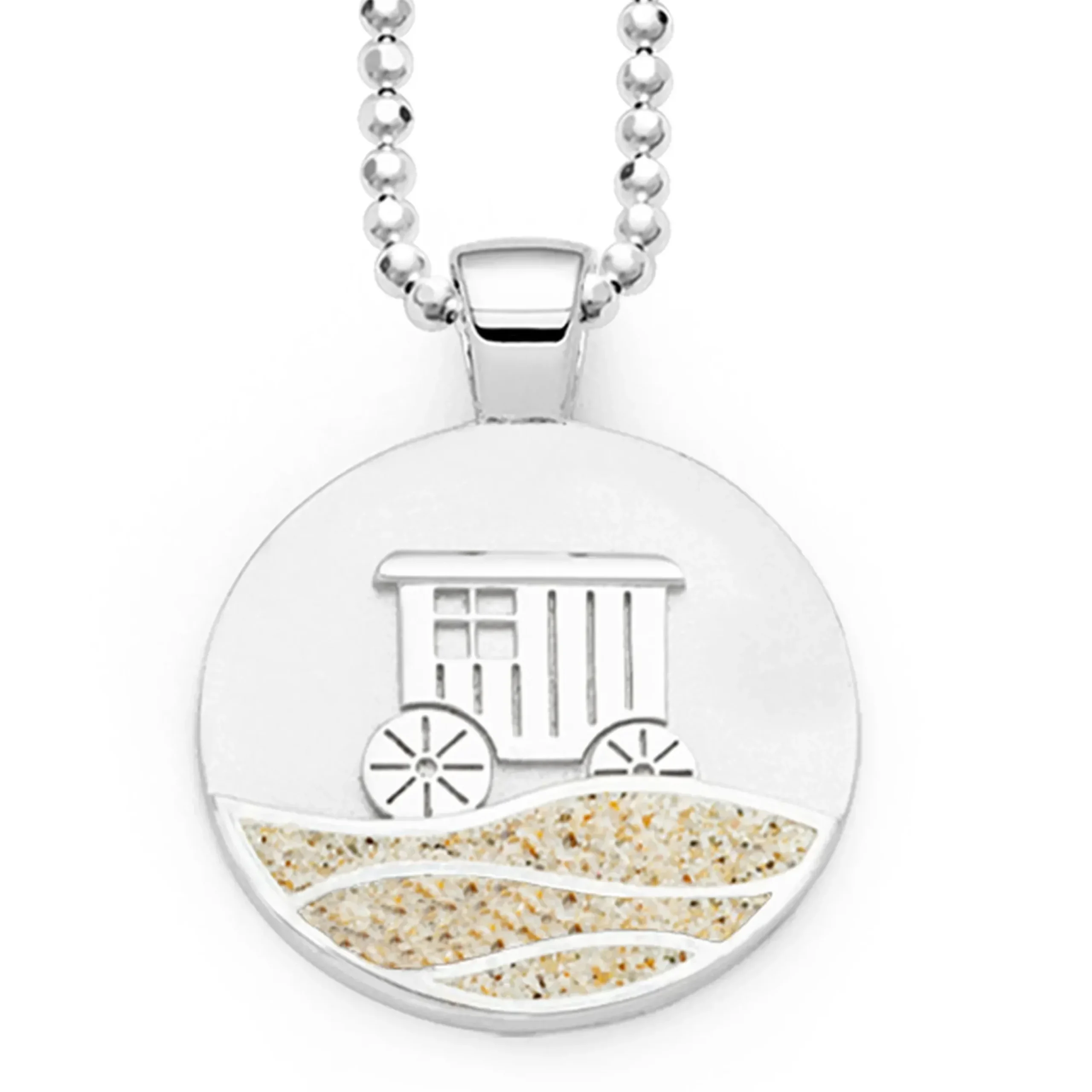 Runder Anhänger Strandwellen „Norderney“ mit dem Motiv: Badekarren, die Wellen sind eingebettet in Strandsand, alles gefasst in poliertem, rhodiniertem 925er Sterling-Silber.