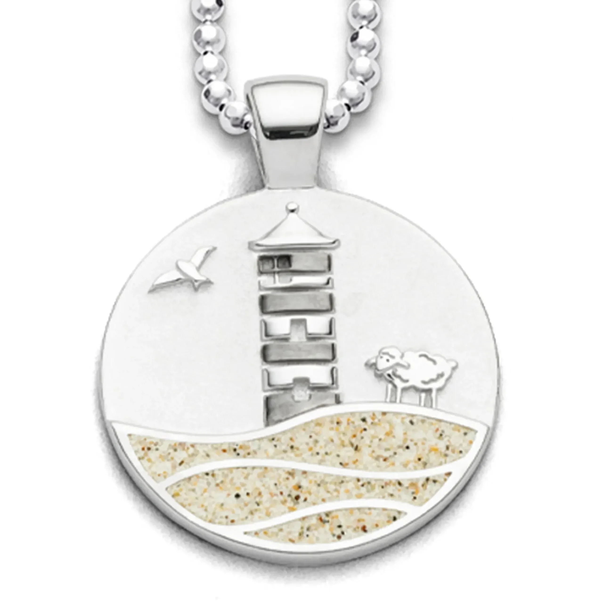 Runder Anhänger Strandwellen „Pilsumer Leuchtturm“ mit dem bekannten Motiv aus Ostfriesland: Otto-Turm, Schaf und einer Möwe, die Wellen sind eingebettet in Strandsand und auf der Rückseiite die Koordinaten des Leuchtturms eingraviert, alles gefasst in poliertem, rhodiniertem 925er Sterling-Silber.