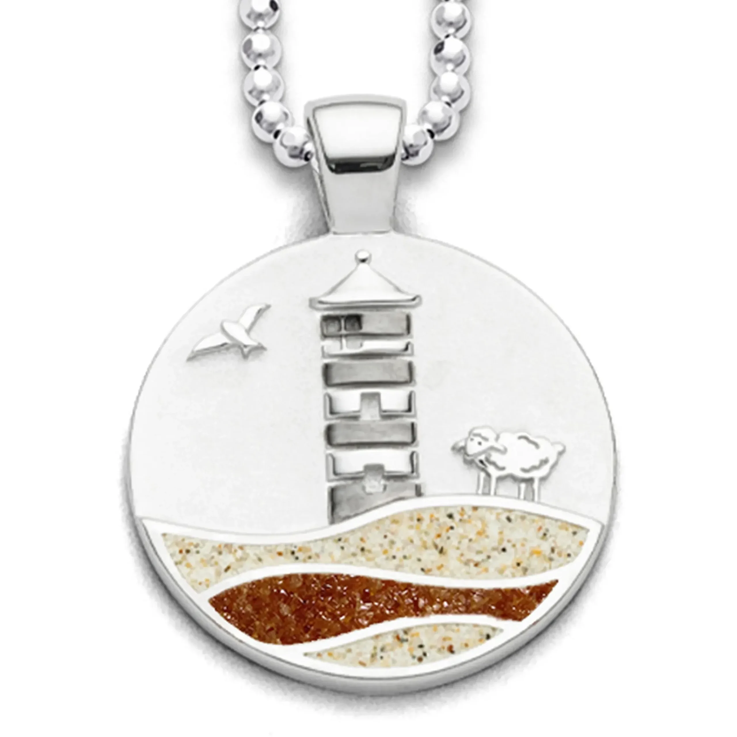 Runder Anhänger Strandwellen „Pilsumer Leuchtturm“ mit dem bekannten Motiv aus Ostfriesland: Otto-Turm, Schaf und einer Möwe, die Wellen sind eingebettet in Strandsand und Bernsteinsand und auf der Rückseite die Koordinaten des Leuchtturms eingraviert, alles gefasst in poliertem, rhodiniertem 925er Sterling-Silber.