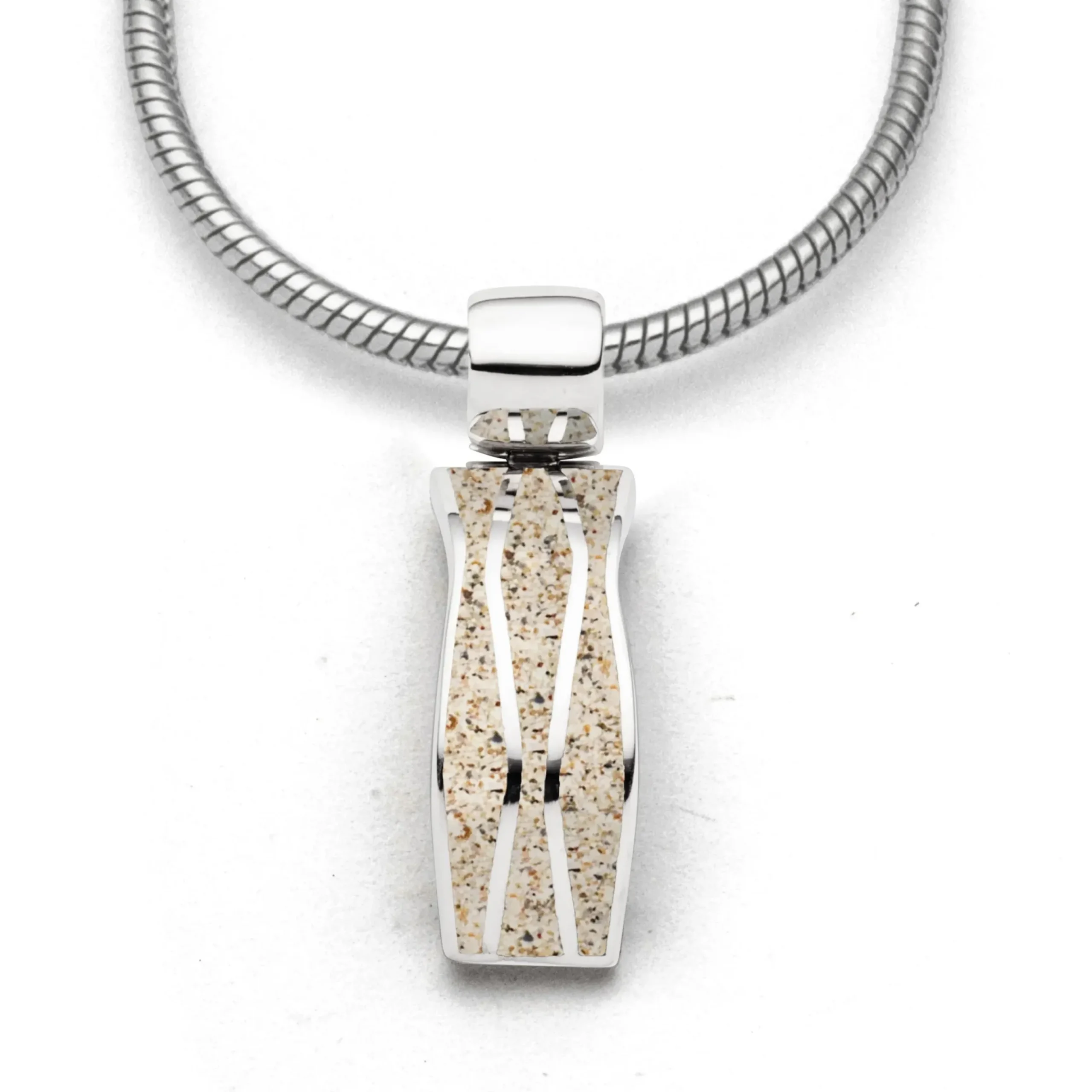 Anhänger „Welle 2.0“ mit silbernen Wellen, eingebettet in Strandsand, gefaßt in rhodinierten 925er Sterling-Silber