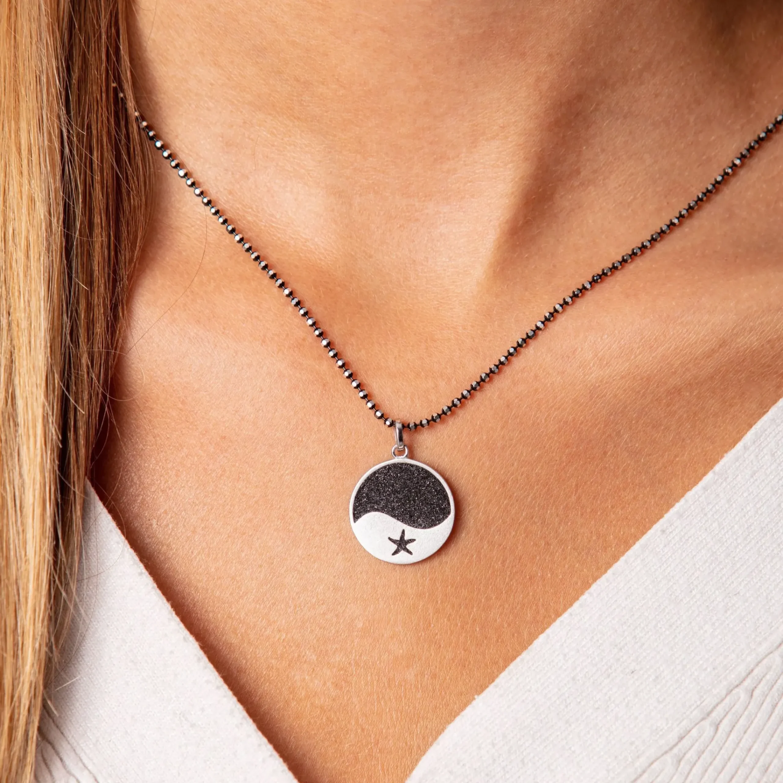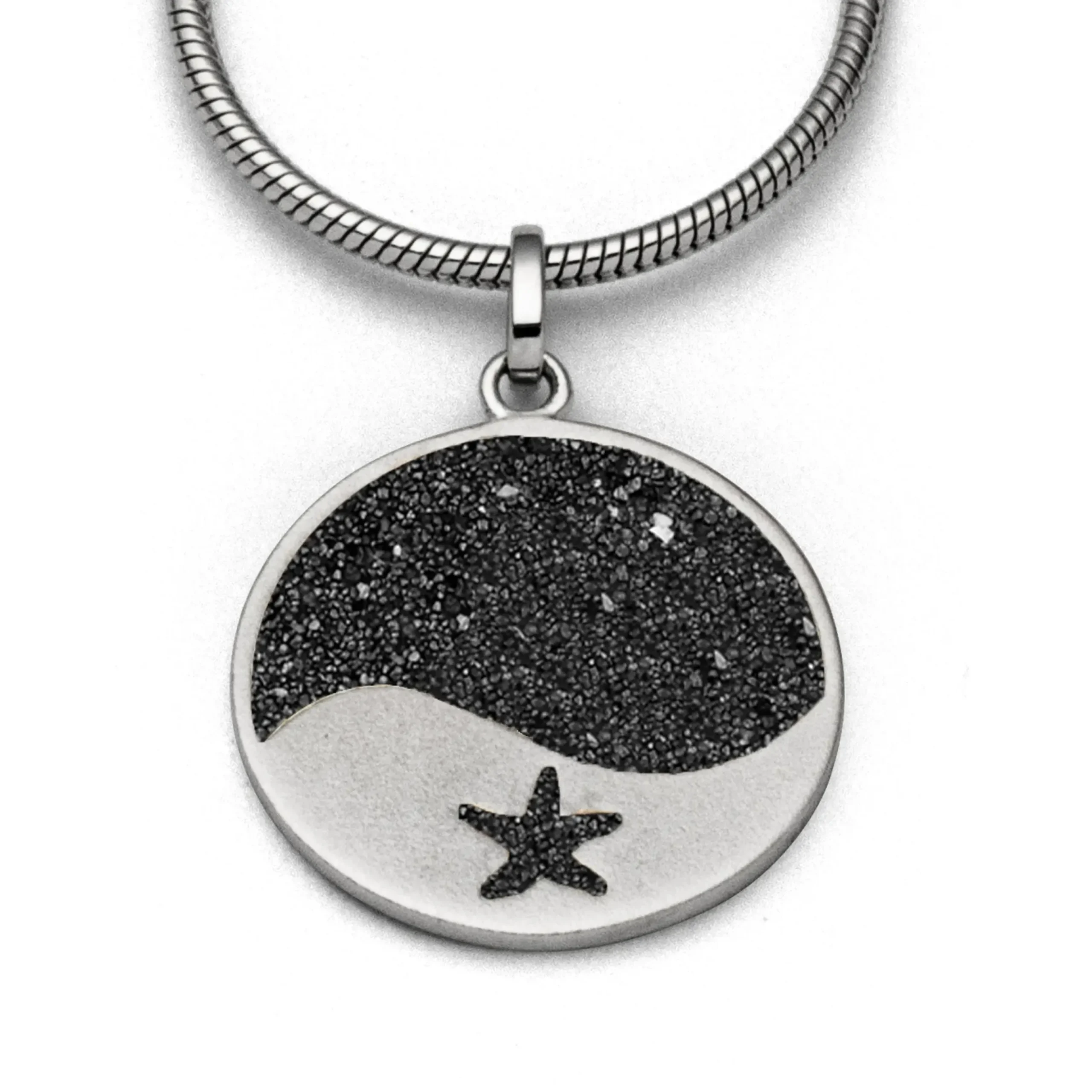 Runder Anhänger mit einer Welle und Seestern, zur Hälfte eingebettet in Lavasand und gefasst in rhodiniertem, mattiertem 925er Sterling-Silber.