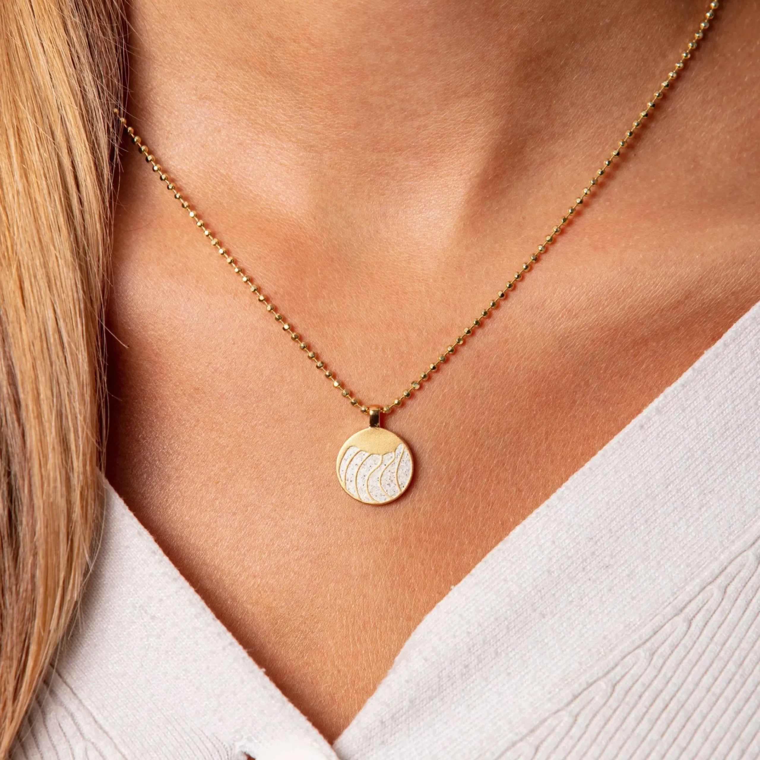 Anhänger „Welle“, ein zierlicher runder Anhänger mit einem Wellenmuster, gefüllt mit Strandsand und gefasst in mattem, vergoldetem 925er Sterling-Silber. Gut kombinierbar mit einer vergoldeten Kugelkette.