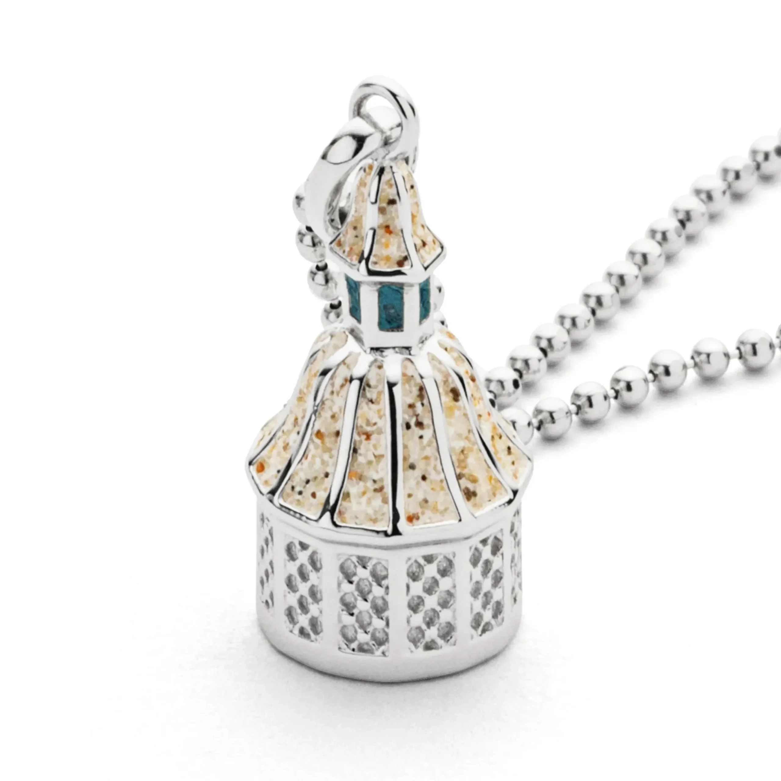 Anhänger „Wismar“ 3D Motiv: Wismarer Wasserkunst, gefüllt mit Strandsand und blauem (Kyanit) Steinsand, aus rhodiniertem 925er Sterling-Silber
