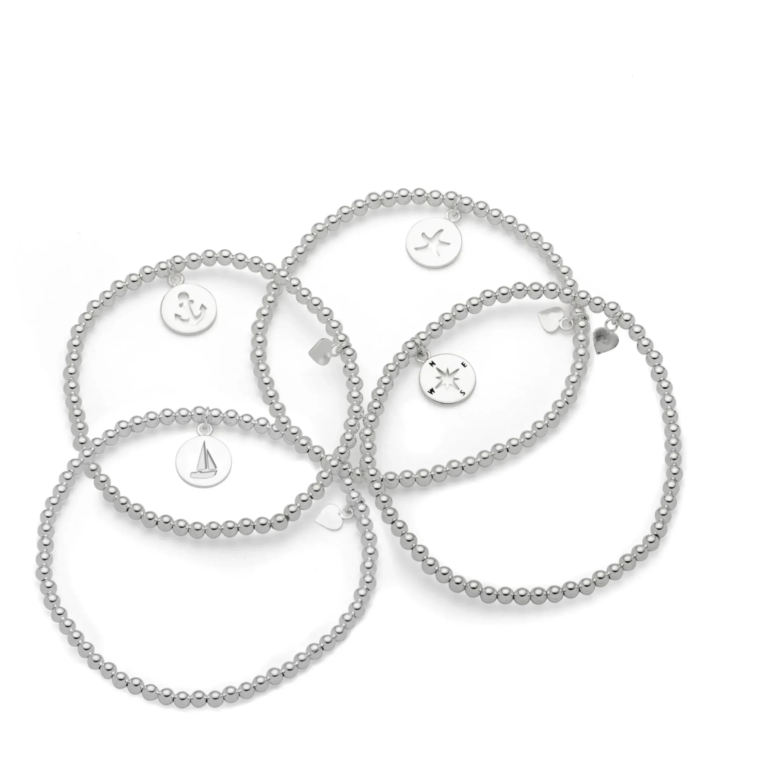 Kugelarmband, aufgezogen auf einem Elastikband, einem maritimen Anhänger als Mittelteil. Länge 195 mm