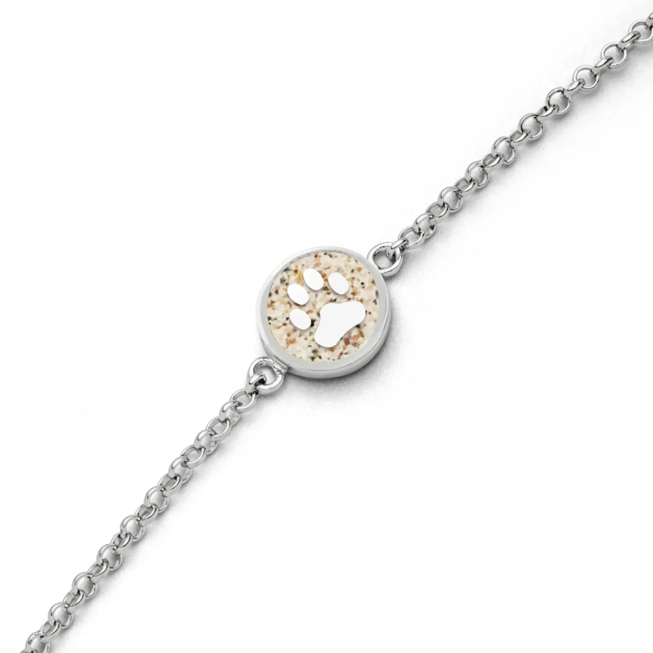 Armband „Lucky Dog“ mit einem runden, mit Strandsand gefüllten Element aus rhodiniertem 925er Sterling-Silber, ca.16.5 cm lang plus 3 cm Verlängerung. Durch die Rhodinierung ist das Schmuckstück anlaufgeschützt.