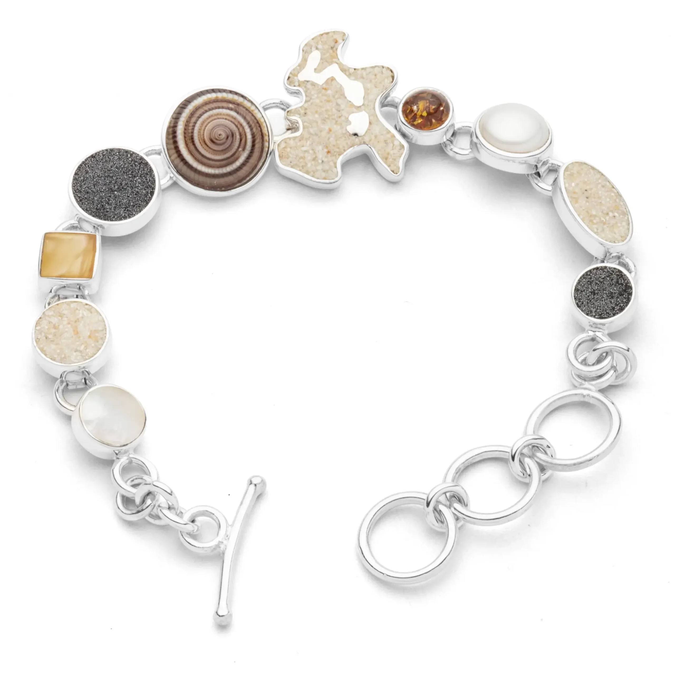 Maritimes Armband Strandrausch „Rügen“ mit verschieden geformten Elementen, gefüllt mit Lavasamd, Muschel, Perle, Bernstein, Strandsand und Spiral brown, in der Mitte befindet sich die Inselsilhouette mit kleinem Jasmunder Bodden gefüllt mit Strandsand, alles gefasst in 925er Sterling-Silber, ca. 15,5 cm lang + 3 cm Verlängerung