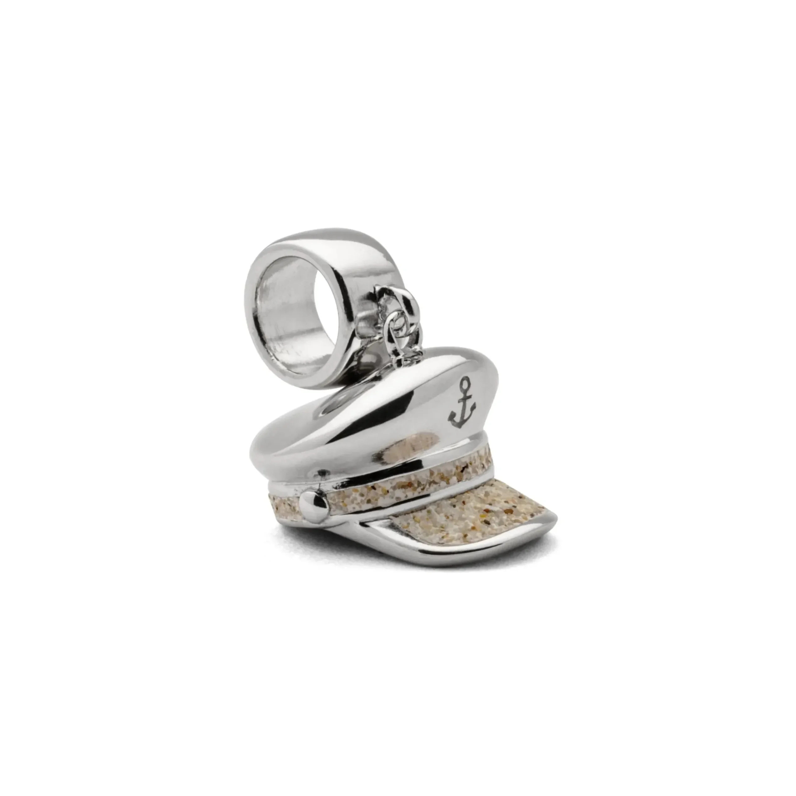 Echte Sehnsucht: Charm in Form einer Kapitänsmütze, der Schirm der Mütze ist mit Strandsand gefüllt und alles aus poliertem und rhodiniertem 925er Sterling-Silber. Zu kombinieren mit A 1134 in verschiedenen Längen.