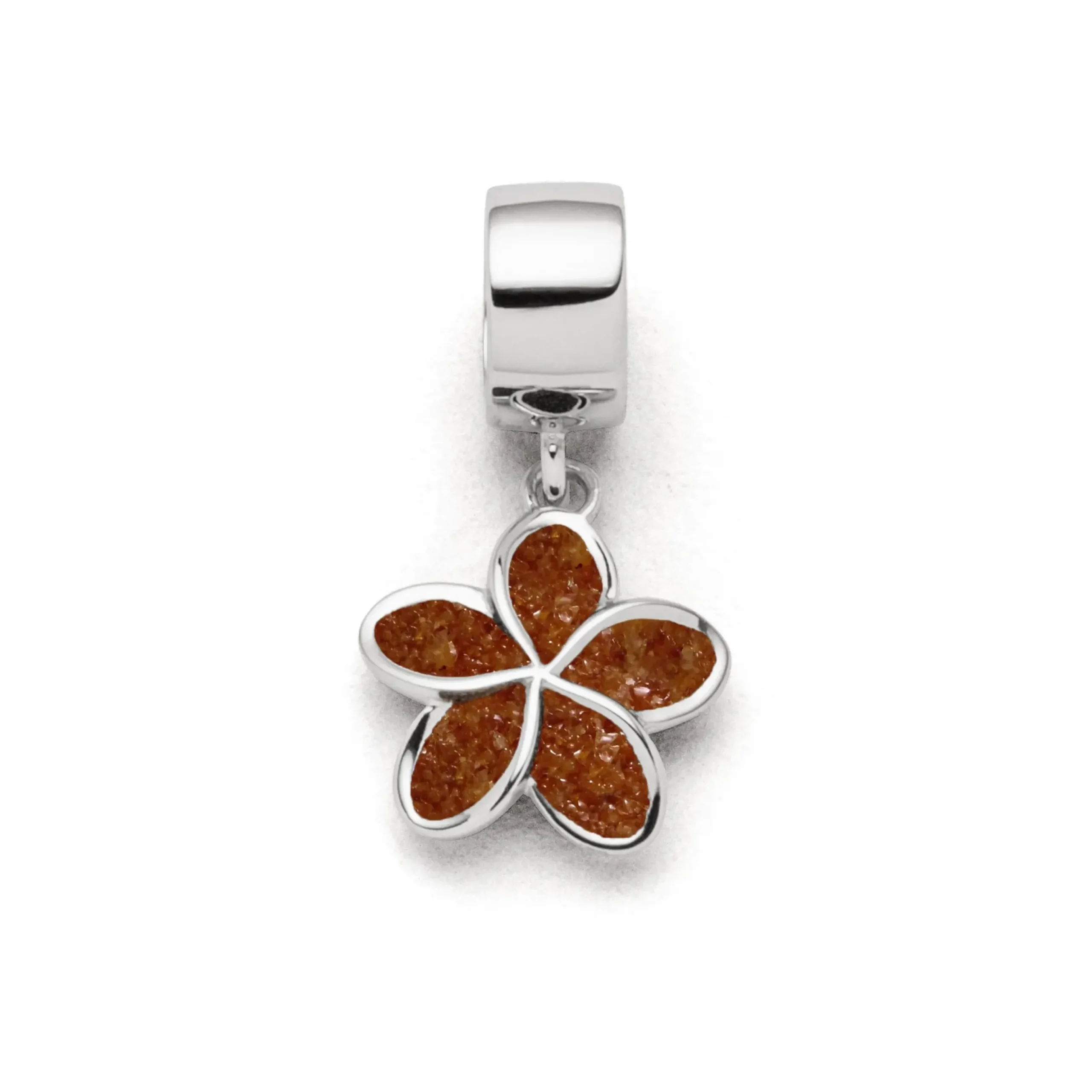 Echte Sehnsucht: Charm in Form einer Plumeria Blüte, teilweise gefüllt mit Bernsteinsand, alles aus poliertem und rhodiniertem 925er Sterling-Silber. Zu kombinieren mit A 1134 in verschiedenen Längen.