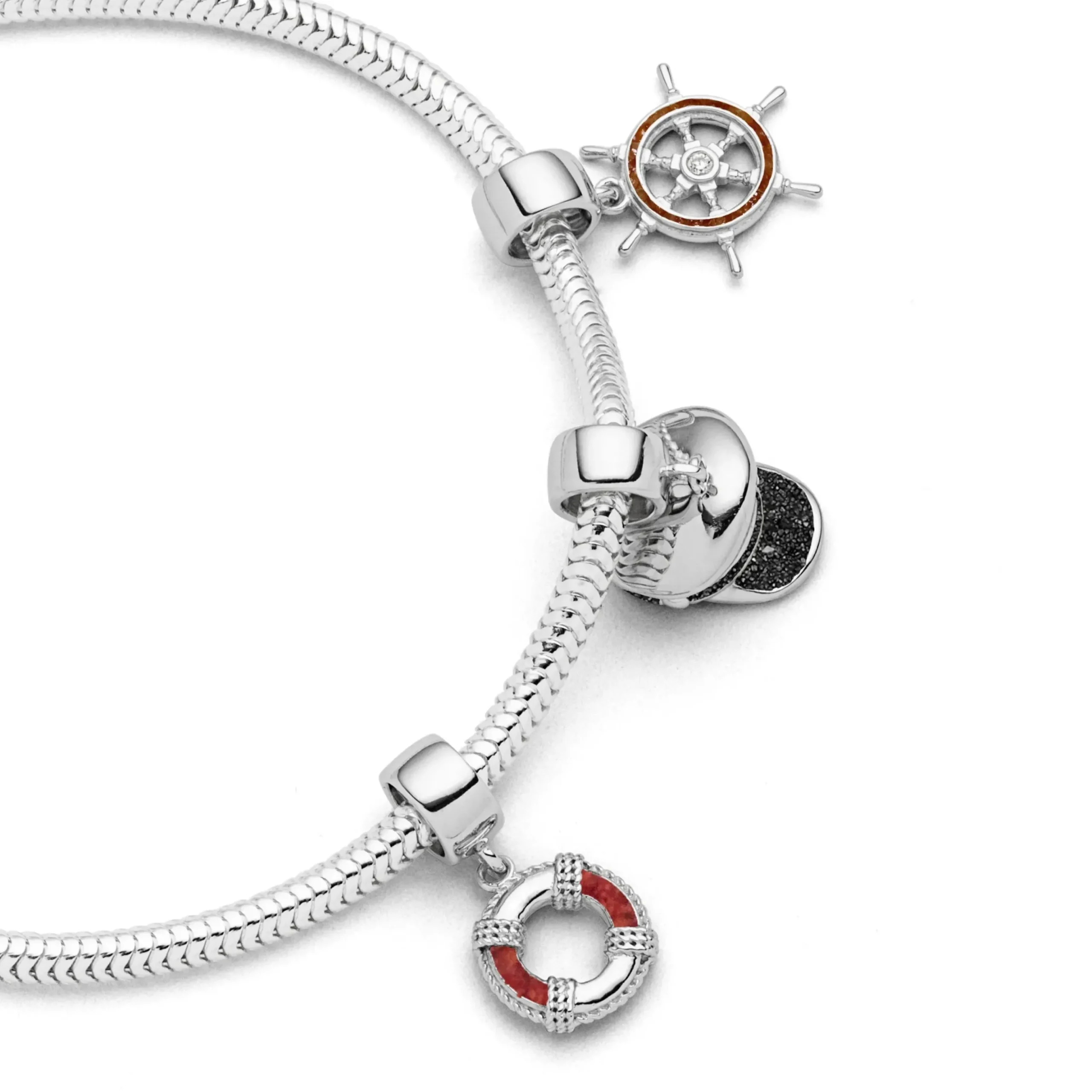 Echte Sehnsucht: Charm in Form eines Rettungsringes, teilweise gefüllt mit Korallensand, alles aus poliertem und rhodiniertem 925er Sterling-Silber. Zu kombinieren mit A 1134 in verschiedenen Längen.