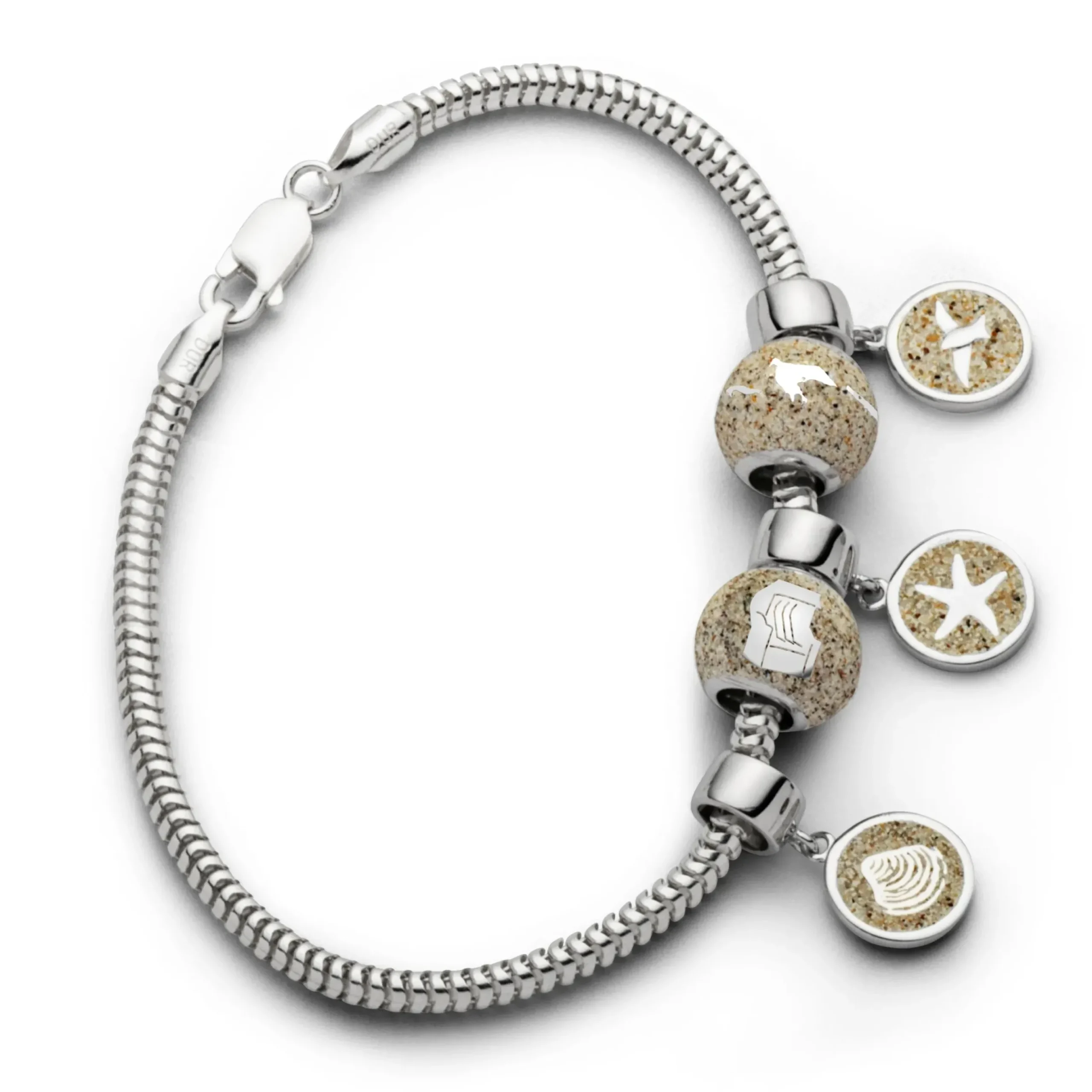Sonne, Strand und Meer! Dieser kleine aber dennoch aussagekräftige Charm-Anhänger mit silbernem Motiv (Herz, Möwe, Kompass, Anker, Muschel oder Stern) und echtem Sand vom Strand zaubert Urlaubsmomente an Ihr Handgelenk und ist daher unverzichtbar für alle, die ein maritimes Statement setzen möchten.Der einzigartige Anhänger verzaubert mit klarem, glänzenden Design und besticht durch die außergewöhnliche Materialkombination von feinem Strandsand und hochwertigem 925er Sterlingsilber.Durch die hohe symbolische Aussagekraft der unterschiedlichen Motive, ist der glanzvolle Anhänger ein echter Blickfang, der Ihre Persönlichkeit unterstreicht und jedes Outfit aufwertet.Mit einem Innendurchmesser von 5 mm lässt sich der Charm-Anhänger wunderbar mit allen gängigen Sammelarmbändern kombinieren. Somit können Sie jedem Schmuckstück eine persönliche Note verleihen.