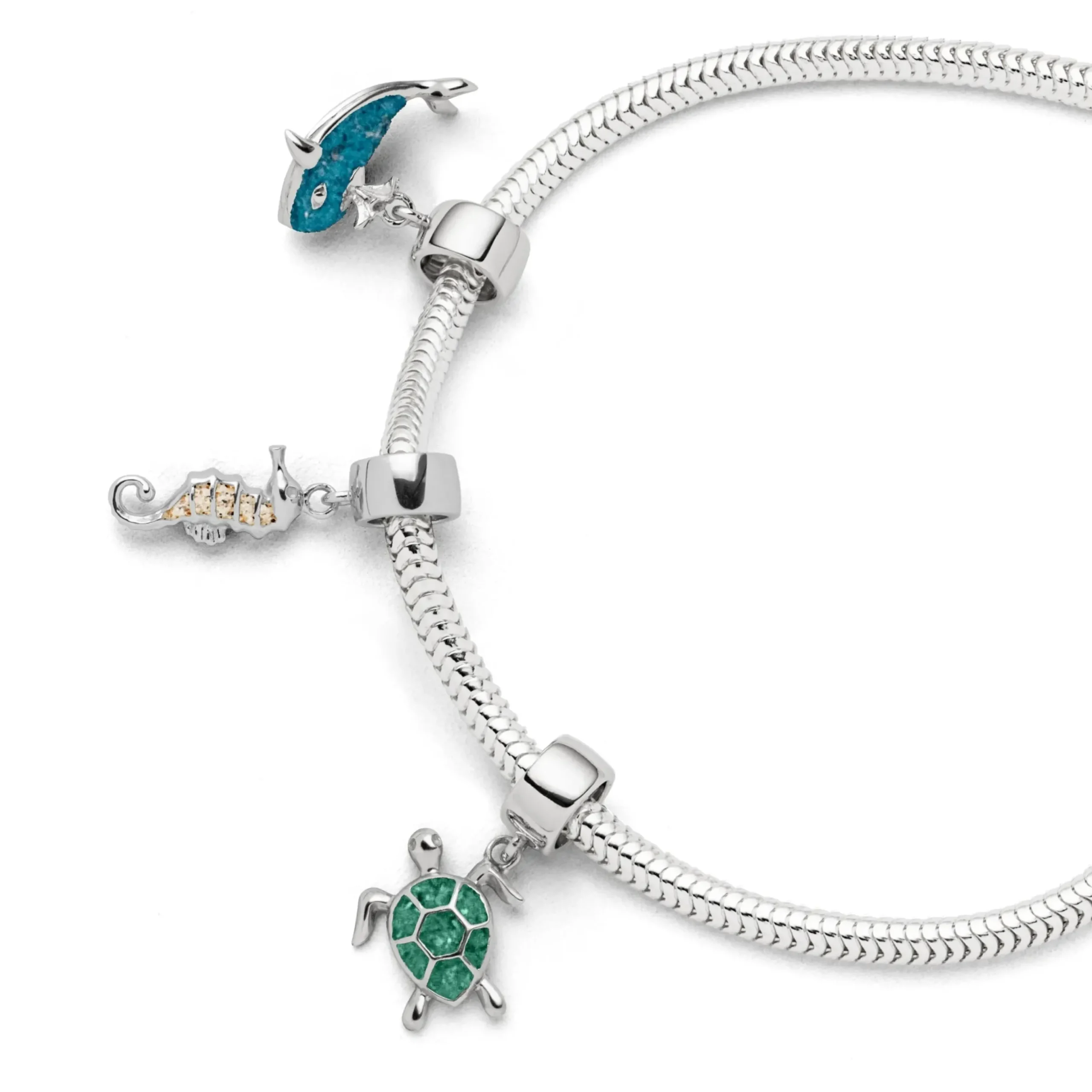 Echte Sehnsucht: Charm in Form eines Walfisches, teilweise gefüllt mit blauem Steinsand, alles aus poliertem und rhodiniertem 925er Sterling-Silber. Zu kombinieren mit A 1134 in verschiedenen Längen.