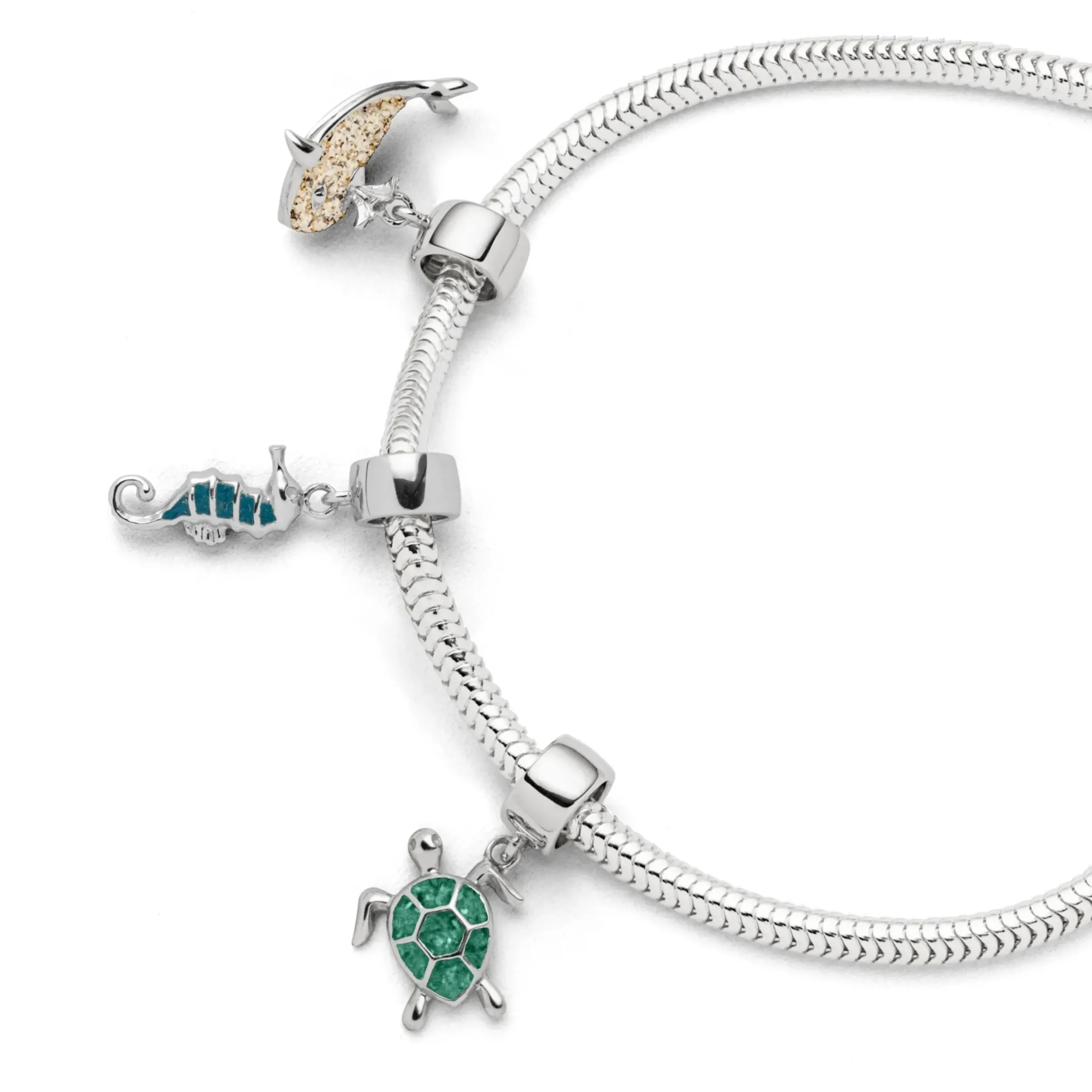 Echte Sehnsucht: Charm in Form eines Walfisches, teilweise gefüllt mit Strandsand, alles aus poliertem und rhodiniertem 925er Sterling-Silber. Zu kombinieren mit A 1134 in verschiedenen Längen.