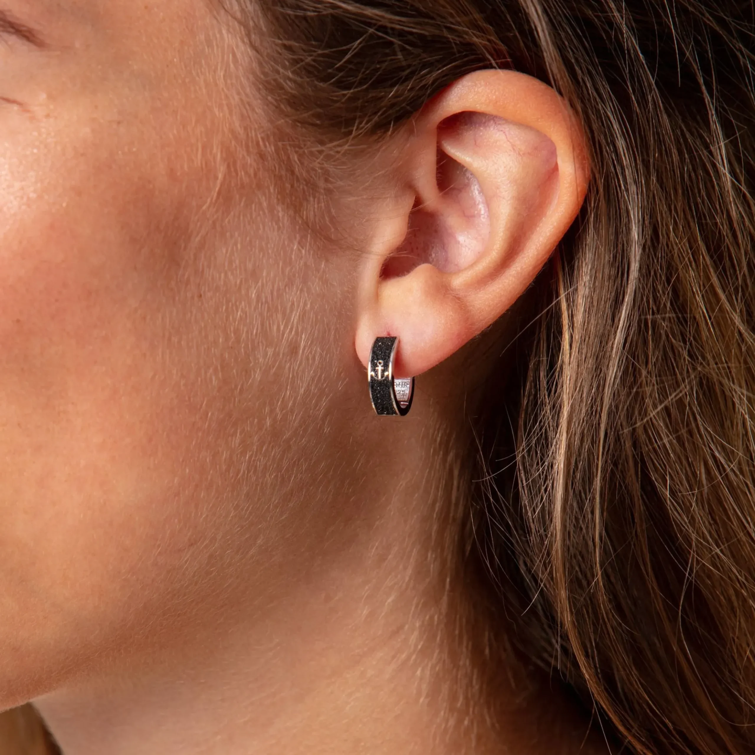 Klappcreole „Anker“ mit einem kleinen in Lavasand gebetteten Anker, gefaßt in rhodiniertem 925er Sterlingsilber.