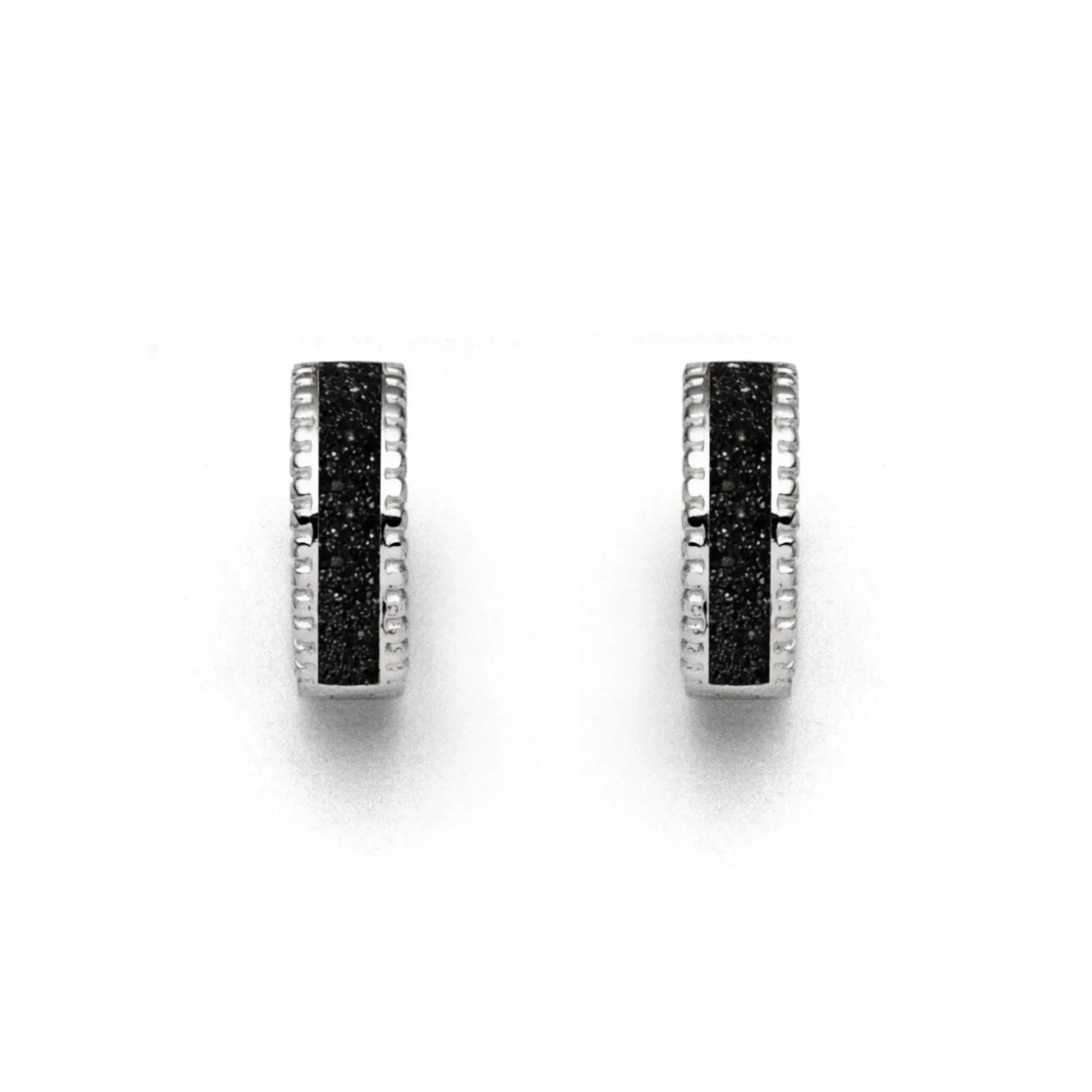 Klappcreole „Jupiter“ mit kleinen Silberkügelchen am Rand und gefüllt mit Lavasand, gefasst in rhodiniertem 925er Sterling-Silber. Durch die Rhodinierung ist das Schmuckstück anlaufgeschützt