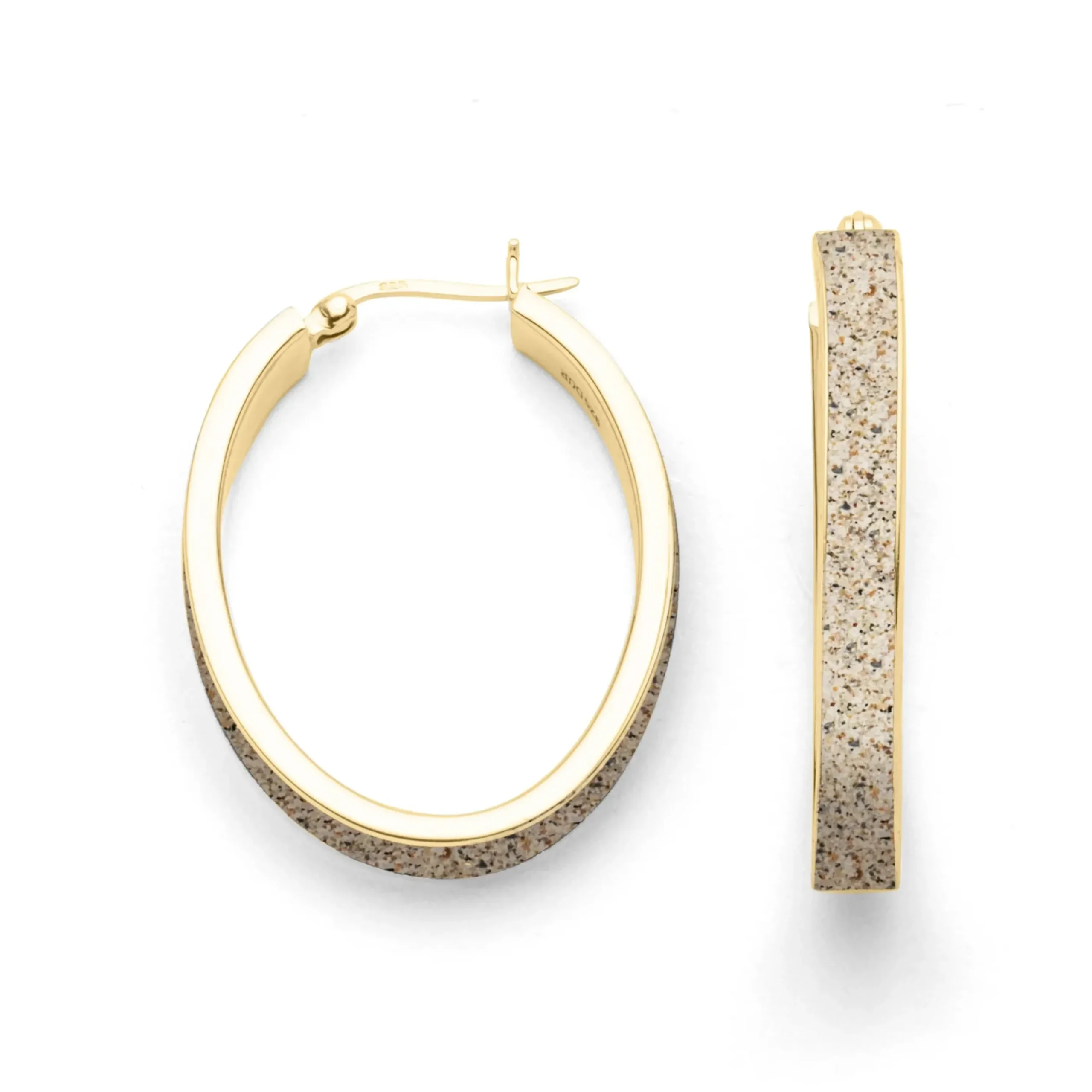 Creole oval 36,8 mm gefüllt mit Strandsand, gefaßt in vergoldetem 925er Sterlingsilber.