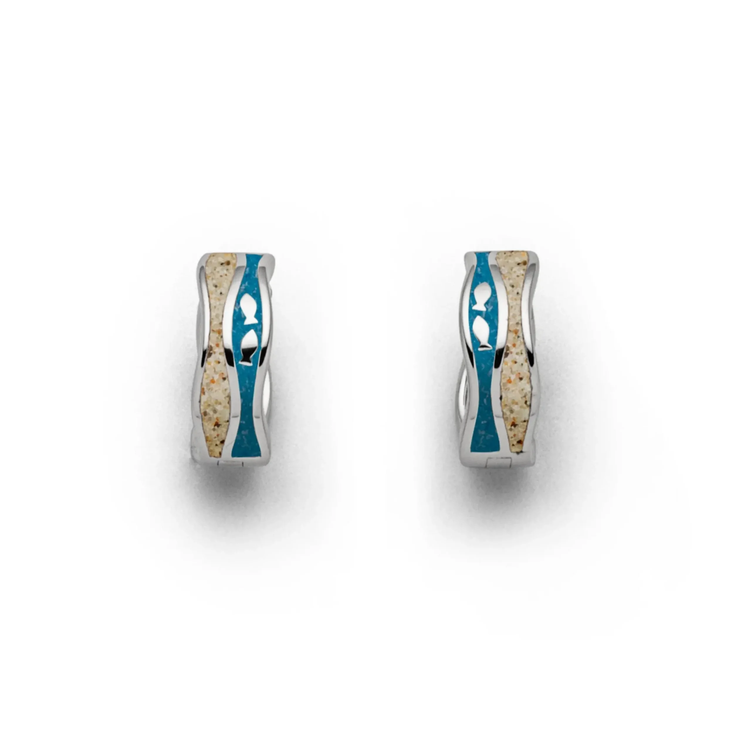 Creole Strandwelle „Fischschwarm“, ein Teil mit blauem Steinsand gefüllt, der andere Teil mit Strandsand gefüllt, alles aus rhodiniertem 925er Sterling-Silber. Durch die Rhodinierung ist das Schmuckstück anlaufgeschützt.
