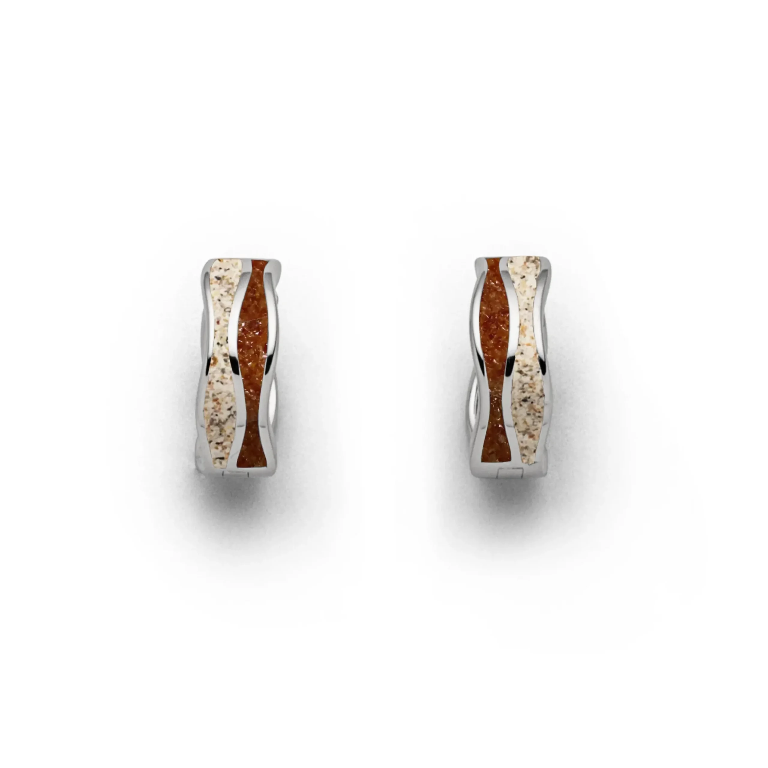 Creole „Strandwellen“, eine Hälfte mit Strandsand und die andere mit Bernsteinsand gefüllt, getrennt durch eine Welle, alles aus rhodiniertem 925er Sterling-Silber. Durch die Rhodinierung ist das Schmuckstück anlaufgeschützt.