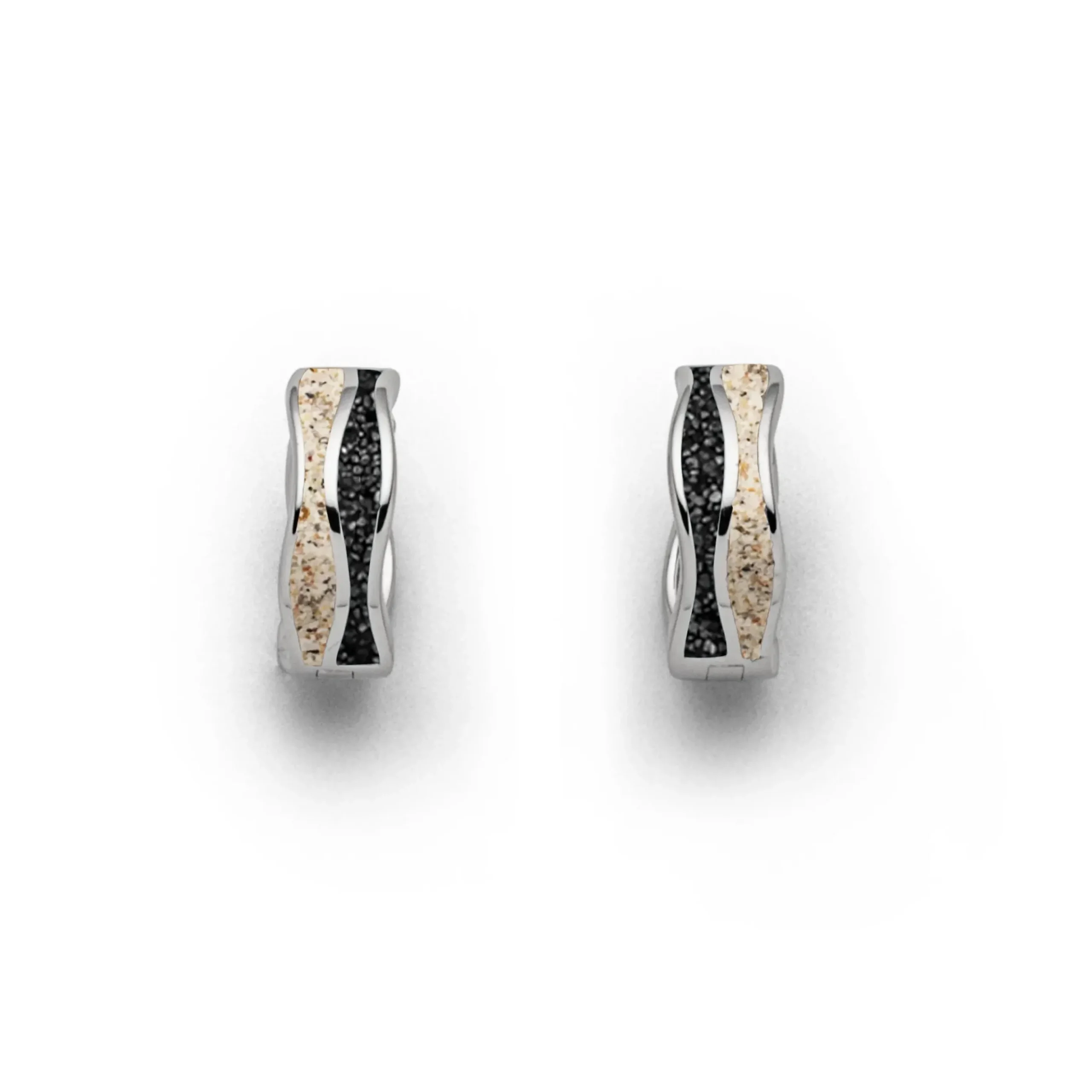 Creole „Strandwellen“ eine Hälfte mit Strandsand und die andere mit Lavasand gefüllt, getrennt durch eine Welle, alles aus rhodiniertem 925er Sterling-Silber. Durch die Rhodinierung ist das Schmuckstück anlaufgeschützt.