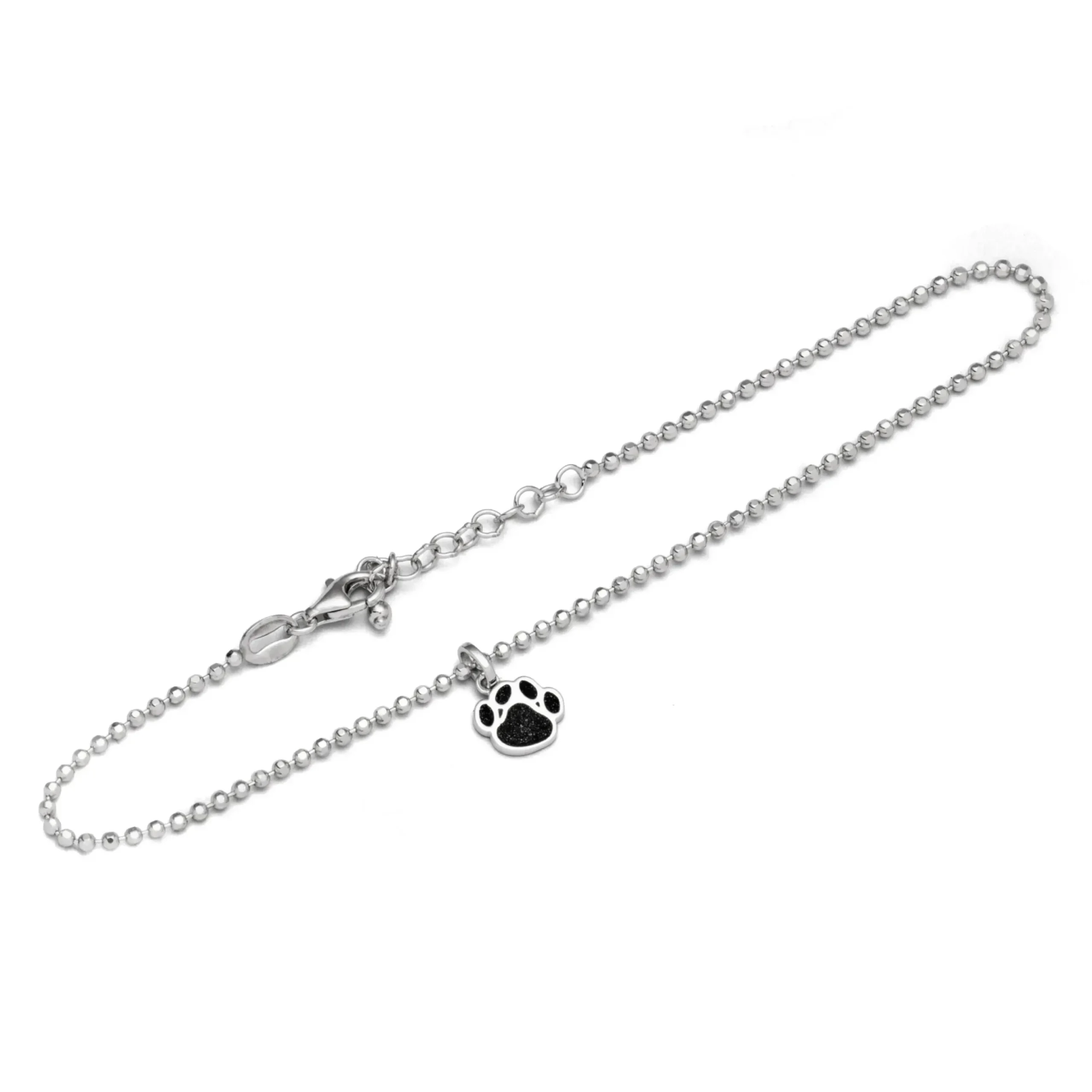 Diamantierte Kugelfußkette, rhodiniert mit einem Anhänger in Form einer Hundepfote, eingebettet in Lavasand, alles aus poliertem und rhodiniertem 925er Sterling-Silber, ca. 22,5 cm lang + 3 cm Verlängerungskette.
