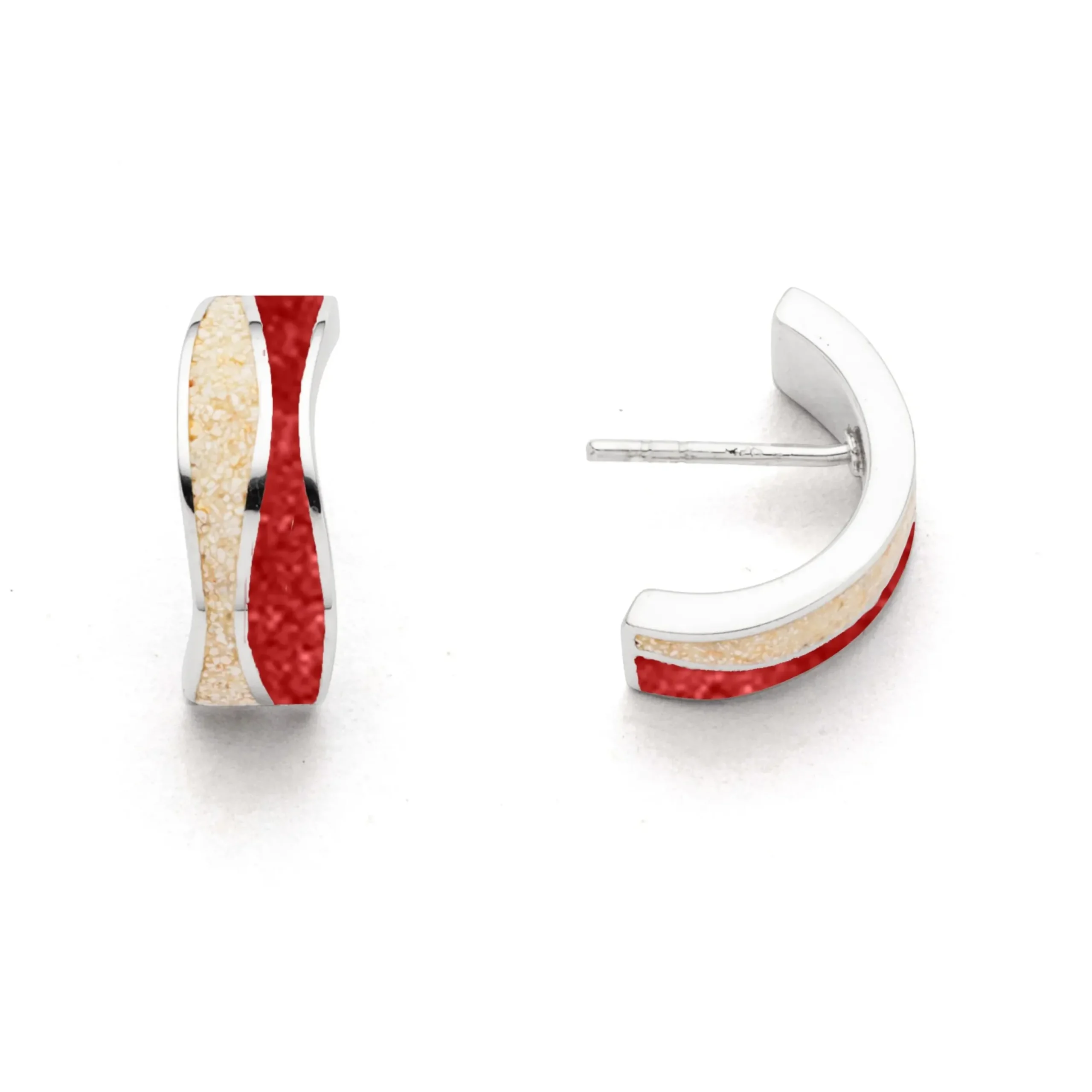 Halbcreole „Welle 2.0“, eine Hälfte mit Strandsand und die andere mit Mosaikkoralle gefüllt, getrennt durch eine Welle, alles aus rhodiniertem 925er Sterling-Silber. Durch die Rhodinierung ist das Schmuckstück anlaufgeschützt.