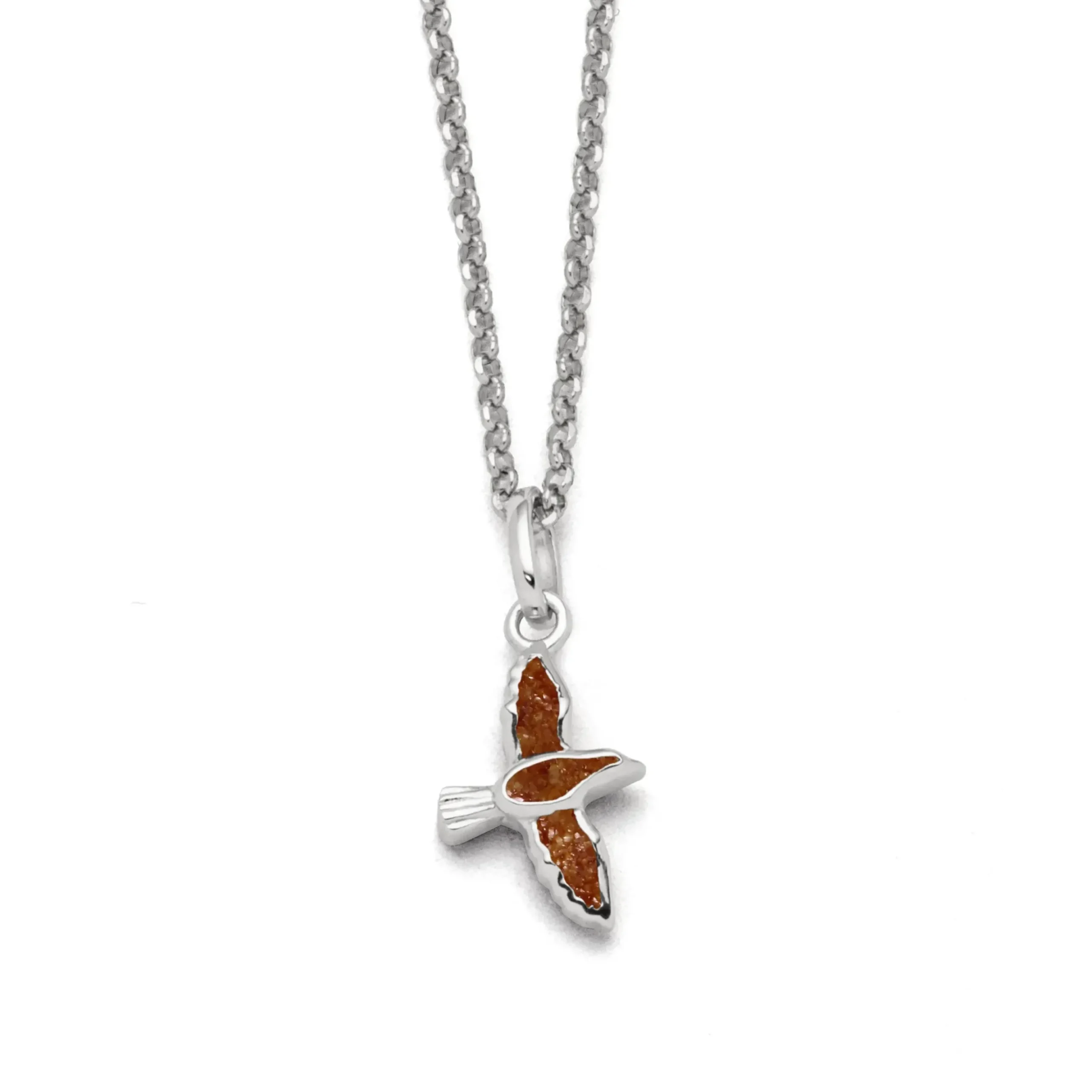 Echte Sehnsucht: Feine Erbskette rhodiniert mit einem Anhänger in Form einer Möwe, gefüllt mit Bernsteinsand, alles aus poliertem und rhodiniertem 925er Sterling-Silber, ca. 42 cm lang. Durch die Rhodinierung ist das Schmuckstück anlaufgeschützt.