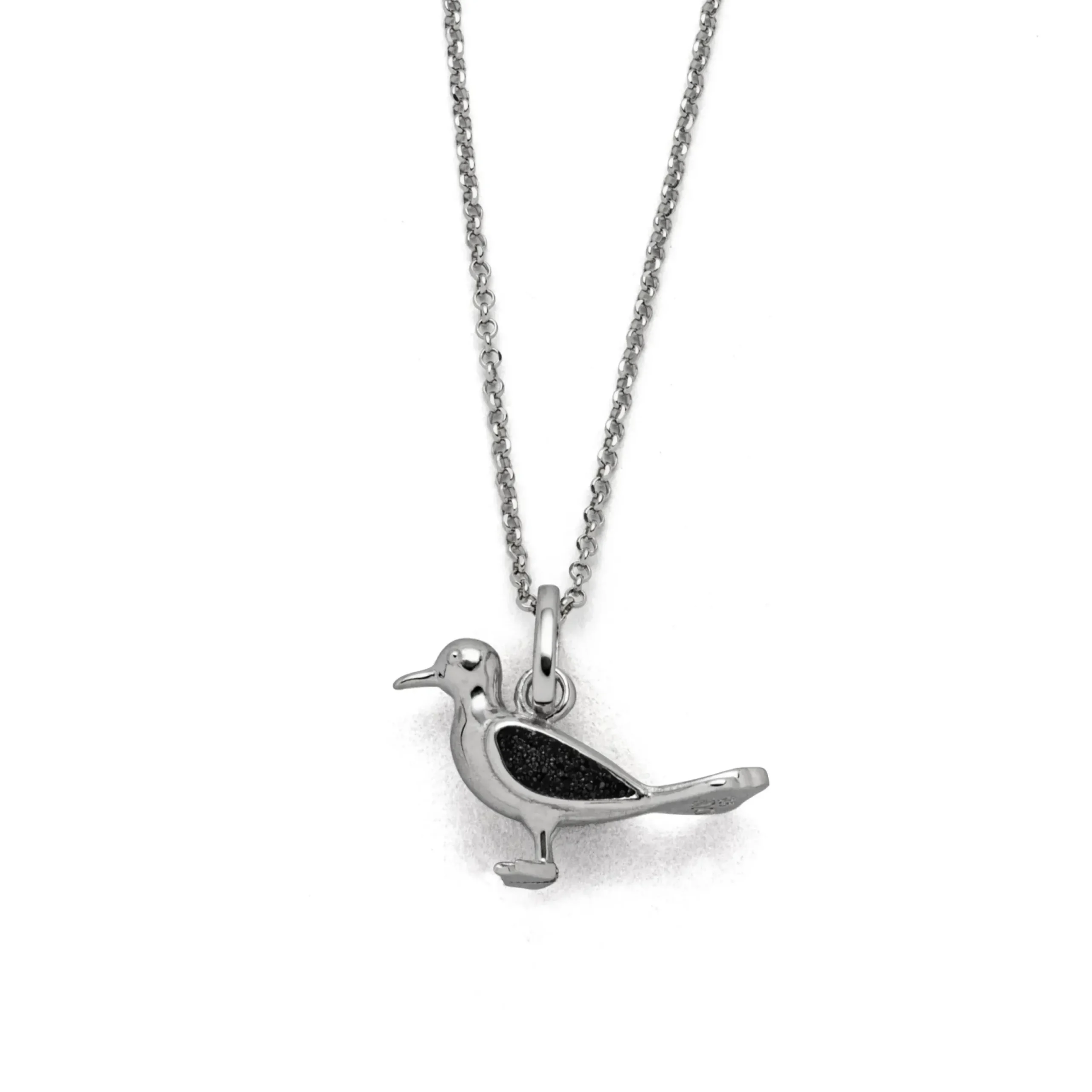 Echte Sehnsucht: Feine Erbskette rhodiniert mit einem Anhänger in Form einer Möwe, teilweise gefüllt mit Lavasand, alles aus poliertem und rhodiniertem 925er Sterling-Silber, ca. 45 cm lang. Durch die Rhodinierung ist das Schmuckstück anlaufgeschützt.