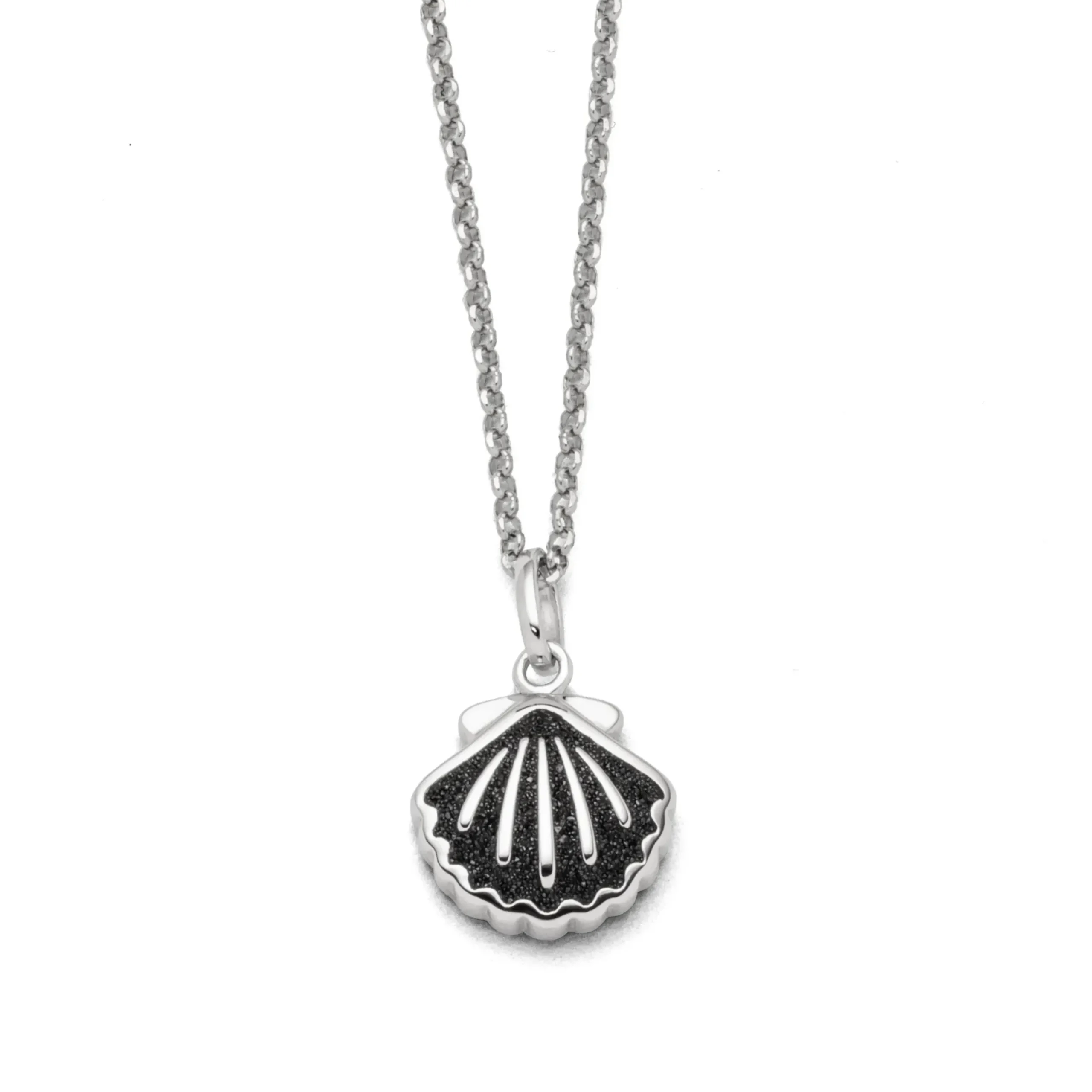 Echte Sehnsucht: Feine Erbskette rhodiniert mit einem Anhänger in Form einer Muschel, gefüllt mit Lavasand, alles aus poliertem und rhodiniertem 925er Sterling-Silber, ca. 45 cm lang. Durch die Rhodinierung ist das Schmuckstück anlaufgeschützt.